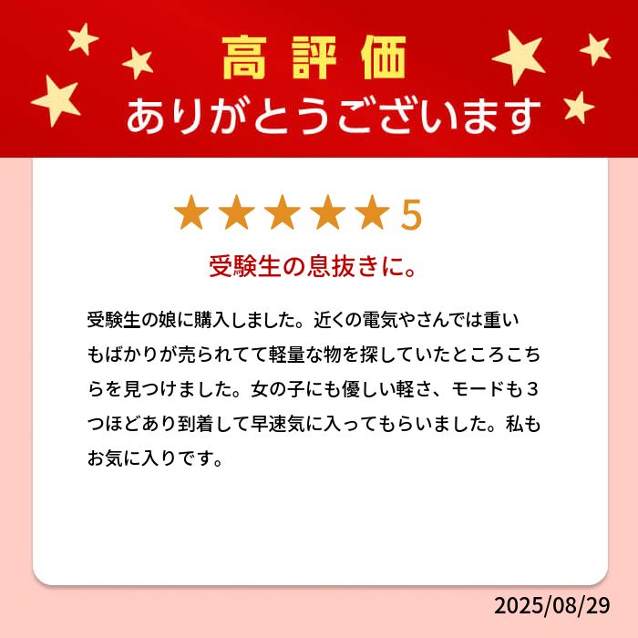 ご注文内容についてお客様への確認が必要な場合、出荷にお時間をいただきます。 商品数量とご購入ラッピング枚数が一致しない場合、商品の包装はせず、ラッピングバッグを同梱してお送りいたします。 ラッピングを商品とご一緒に注文されていない場合、ラッピングをせずに商品を出荷いたします。詳しくはこちらをご覧ください。 品名 ルルド ネックマッサージャー プロ 品番 AX-HPL312OR / テラコッタオレンジ AX-HPL312BK / サンドブラック 医療機器認証番号 303AABZX00085000 使用目的又は効果 あんま、マッサージの代用。一般家庭で使用すること。 (疲労回復、 血行をよくする、 筋肉の疲れをとる、 筋肉のこりをほぐす、 神経痛、筋肉痛の痛みの緩解) 仕様 ■素材: 本体:ABS樹脂、ウレタンフォーム カバー表地:【OR、BK】ポリエステル80%、レーヨン20% マッサージ部:ポリエステル100% ■電源:AC100V(50/60Hz) ■消費電力:18W ■回転数:約28〜38回転/分 ■タイマー: 約10分自動OFF ■付属品:ACアダプター ■生産国:中国 ■保証期間:1年 サイズ・重量 ■本体サイズ: (約)W270×L150×H130mm ■重量: (約)0.9kg(アダプター含まず) ■電源コード: (約)2m 梱包仕様 化粧箱1個口 ■サイズ: (約)W310×L130×H160mm ■重量: (約)1.3kg 関連キーワード 20代 30代 40代 50代 60代 70代 大人 男性 女性 彼氏 彼女 お父さん 父親 お母さん 母親 ギフト プチギフト プレゼント お祝い お返し クリスマス バレンタインデー ホワイトデー 父の日 母の日アテックスの人気ネックマッサージャー その他のネックマッサージャーをみる→