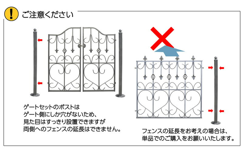 ------------------------------------------- ◆SPEC◆ ●商品品番:ief-mdgt90ubset ●商品サイズ ・ゲート面のみ 幅90cm×高さ90cm ・ゲートセット 幅101.5cm×高さ95cm ●材質:アイアン ●形状:組立品 ●塗装:粉体塗装(ハンマートーン仕上げ) ●製造国:中国 ●商品説明 両開きゲート1枚と支柱2本と支柱固定用金具付き(土の地面用)2個のセット商品です。 門扉(ゲート)が取り付けられて、アンカーボルト固定もでき、土の地面にも設置できる本格システムフェンスです。 カラーは華やかなシルバー。ハンマートーン塗装で、表面の凸凹が風合いと立体感を醸し出します。曲線をふんだんに取り入れたフェンスデザインがゴージャスです。 ■ご注意ください■ アイアン製品に関して・・・ アイアン製品は素材の性質上、錆が発生しやすいです。 早期の腐食を防止し美しくお使いいただくために、お届け直後の錆止め材の塗布をおすすめしております。 また、ご使用開始後も定期的なお手入れ(さび落としやさび止め塗料の塗装等)をおすすめいたします。 ●商品キーワード アイアンゲート アンティーク ガーデンゲート ペット ゲート 支柱 金具 犬 屋外 アイアン 猫 脱走防止 出入口 庭 フェンス 扉 ガーデン ドア 両開き 門扉 玄関