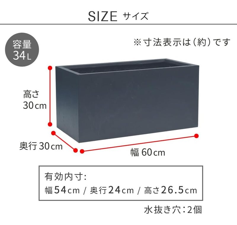 ファイバークレイプランター【クレイボックス】 【クレイボックス 36×36】 幅36×奥行36×全高36cm ボックス内寸 幅30×奥行30×高さ32.5cm 容量:32L 水抜き穴:1個 【クレイボックス 40×40】 幅40×奥行40×全高40cm ボックス内寸 幅34×奥行34×高さ365cm 容量:42L 水抜き穴:2個 【クレイボックス 50×50】 幅50×奥行50×全高50cm ボックス内寸 幅44×奥行44×高さ45.55cm 容量:87L 水抜き穴:2個 【クレイボックス 60×30】 幅60×奥行30×全高30cm ボックス内寸 幅54×奥行24×高さ26.5cm 容量:34L 水抜き穴:2個 【クレイボックス 80×39】 幅80×奥行39×全高39cm ボックス内寸 幅74×奥行33×高さ34cm 容量:83L 水抜き穴:3個 【クレイボックス 90×44】 幅90×奥行44×全高44cm ボックス内寸 幅84×奥行37×高さ39cm 容量:121L 水抜き穴:3個 素材: ファイバークレイ カラー: ブラック・グレイ・ホワイト 完成品