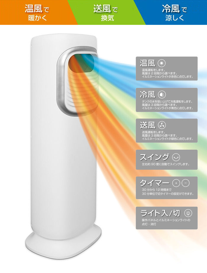 ホット&クールファン MA-874 ホワイトタイプ 【商品名】 ホット&クールファン MA-874 ホワイトタイプ 【サイズ】 本体:約(幅)29.5×(奥行)24×(高さ)81.5cm 【重量】 約5.5kg 【仕様】 定格電圧:AC100V 定格周波数:50/60Hz 消費電力:温風運転時/980W、冷風運転時/57W、冷風運転時/54W 切 タイマー:30分~12時間(30分単位) 首振り角度:左右約90度 タンク容量:約2L 電源コード長:約1.5m 付属品:保冷剤2個、リモコン(単4形乾電池2本使用)※電池は付属していません。 【素材】 PP樹脂、ABS 樹脂、POM 樹脂 【生産地】 中国 【注意】 ●使用に際しては、取扱説明書を必ずお読みください。 ●機器の分解·改造は絶対におやめください。 ●本製品は、一般家庭用に開発された製品です。事故やけがの原因になりますので、業務用としては絶対に使用しないでください。 【区分】 生活家電 扇風機 【JAN】 4959023330792 ホット&クールファン MA-874 ホワイトタイプ 冷風扇 3WAY ホット&クールファン MA-874 ホワイトタイプ 夏は優しい涼風、冬は暖かな風 オールシーズン使えるから収納不要 これ1台で1年中対応の温風冷風扇 ■冷風扇とは? タンクに水を入れて、気化熱の原理で涼しくなった風を送り出すという身体と自然にやさしい冷風扇です。 1.タンクの水分を含んだ、フィルターのすき間に、室内の暑い空気が吸い込まれます。 2.フィルター部分で水分の蒸発が起こり、気化熱が奪われてフィルターの温度が低下します。 ※気化熱:水分が蒸発するときに周囲から吸収する熱のこと。 3.温度の低下したフィルター部を空気が通過して涼しい風となって吹き出されます。 ・着脱タンク 簡単に着脱できて丸洗いで清潔に。 ・送風モードに合わせて点灯するイルミネーションライト 温風時/送風時/冷風時 ・保冷剤2個付属 保冷剤を冷凍して冷風効果をさらにアップさせます。 ・リモコン付属 送風モードの切替も見やすいボタン操作で簡単に。 ●温風 温風運転をします。風量は2段階から選べます。イルミネーションライトが赤色に点灯します。 ●冷風 タンクの水を吸い上げて冷風運転をします。風量は3段階から選べます。イルミネーションライトが青色に点灯します。 ●送風 送風運転をします。風量は3段階から選べます。イルミネーションライトが緑色に点灯します。 ●スイング 左右約90度に自動でスイングします。 ●タイマー 30分から 12時間まで30分単位で切タイマーの設定ができます。 ●ライト入/切 操作パネルとイルミネーションライトの点灯·消灯 冬は温風で温かく、送風でも使える、夏は冷風で涼しい!