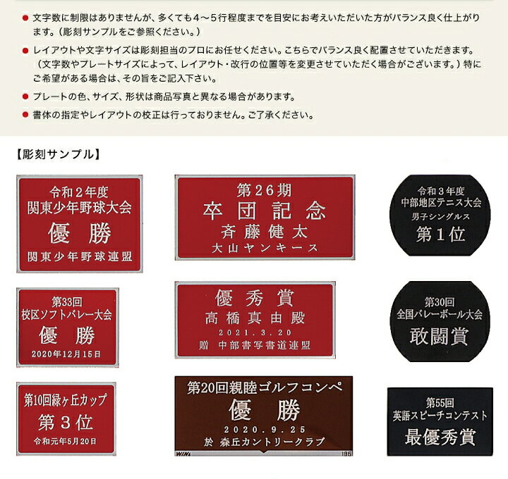 ● 商品説明 業界最安値に挑戦! 金属製プレート単品・文字彫刻代込み 各種サイズご対応可能です。 ご希望のプレートサイズと全く同じものがご用意できない場合は、 ご記載のサイズを最大とした、最も近いサイズで作成させていただきます。 一律料金:税込770円/枚 プレートの裏面が両面テープの仕様になっていますので、簡単に貼ることができます。 ・文字数に制限はありませんが、多くても4〜5行程度までを目安にお考えいただいた方がバランス良く仕上がります。(彫刻サンプルをご参照ください。) ・レイアウトや文字サイズは彫刻担当のプロにお任せください。 こちらでバランス良く配置させていただきます。 (文字数やプレートサイズによって、レイアウト・改行の位置等を変更させていただく場合がございます。) 特にご希望がある場合は、その旨をご記入ください。 ・プレートの色、サイズ、形状は商品写真と異なる場合があります。 ・書体の指定やレイアウトの校正は行っておりません。ご了承ください。 【ご注文方法】 【1】ご希望のプレート数を買い物かごに入れる。 【2】「ご購入手続き」へ進む。 【3】「備考欄」に、プレートサイズ・文字内容を入力する。 ※サイズは「縦△ × 横◇ cm以内」のようにご記載ください 。 ※当店の商品に貼り付ける場合は当店の商品番号をご記載ください。 ※ご注意ください。 ・ご希望のプレートサイズと全く同じものがご用意できない場合は、ご記載のサイズを最大とした、最も近いサイズで作成させていただきます。ご了承ください。 ・元々付いているプレートを上手く剥がすことが難しい場合や、無理に剥がそうとすると商品本体に傷をつけてしまう場合があります。その場合は付いているプレートの上から重ねて貼り付けることをお勧めいたします。プレートの厚さは平均約1mm未満ですので、大きな違和感はございません。 ・プレートの色はお任せとなります。 ・文字の書体は明朝体となります。 ・出来上がりの校正はお受けしておりません。いただいた文字内容を元に、プロの彫刻スタッフが最もバランスの良いレイアウトで作成させていただきます。 ● 発送について 本商品はネコポス(ポスト投函)での発送が可能な商品です。 【日時指定】【代金引換】のご指定がない場合は ネコポスで発送させていただきます。 発送後翌日〜2日後のお届けとなります。 ▽用途・シーン 文字彫刻 / プレートのみ / 両面テープ付 / 表彰 / プレート交換 / 彫刻プレート 単品 / トロフィー / 刻印 / 優勝カップ / ゴルフコンペ / 記念品 / 名入れプレート / 彫刻 / オーダーメイド / イベント用プレート / アルミプレート / 名入れ可能 / 表彰 / 卒団 / チーム記念 / 卒団/卒業 / 記念品 / 寄贈 / 贈答 / 記念 / プレート / 名入れ / 名前 / 刻印 / サービス / プレゼント / ギフト / 記念品 / 貼付け /業界最安値に挑戦! 金属製プレート単品・文字彫刻代込み各種サイズご対応可能です。 ご希望のプレートサイズと全く同じものがご用意できない場合は、ご記載のサイズを最大とした、最も近いサイズで作成させていただきます。 一律料金:税込770円/枚 プレートの裏面が両面テープの仕様になっていますので、簡単に貼ることができます。 【ご注文方法】 【1】ご希望のプレート数を買い物かごに入れる。 【2】「ご購入手続き」へ進む。【3】「備考欄」に、プレートサイズ・文字内容を入力する。※サイズは「縦△ × 横◇ cm以内」のようにご記載ください 。※当店の商品に貼り付ける場合は当店の商品番号をご記載ください。 ※ご注意ください。 ・ご希望のプレートサイズと全く同じものがご用意できない場合は、ご記載のサイズを最大とした、最も近いサイズで作成させていただきます。ご了承ください。・元々付いているプレートを上手く剥がすことが難しい場合や、無理に剥がそうとすると商品本体に傷をつけてしまう場合があります。その場合は付いているプレートの上から重ねて貼り付けることをお勧めいたします。プレートの厚さは平均約1mm未満ですので、大きな違和感はございません。・プレートの色はお任せとなります。・文字の書体は明朝体となります。・出来上がりの校正はお受けしておりません。いただいた文字内容を元に、プロの彫刻スタッフが最もバランスの良いレイアウトで作成させていただきます。 関連商品トロフィー ゴルフ 名入れ彫刻無料 トロフィー 優勝 トロフィー 持ち...優勝カップ ミニ 卒園記念品 卒園 お急ぎ対応可 保育園 幼稚園 運...優勝カップ ミニ 卒園記念品 卒園 お急ぎ対応可 保育園 幼稚園 運...900円1,680円1,390円結婚式 両親 プレゼント お急ぎ対応可 結婚式 両親 贈呈品 名入れ ...子育て感謝状 結婚式 両親 プレゼント 結婚式 両親 贈呈品 メッセー...子育て感謝状 結婚式 両親 プレゼント 結婚式 両親 贈呈品 メッセー...12,000円5,800円7,800円優勝カップ 名入れ お急ぎ対応可 トロフィー 優勝 カップ サッカー ...トロフィー ゴルフ 名入れ彫刻無料 ト