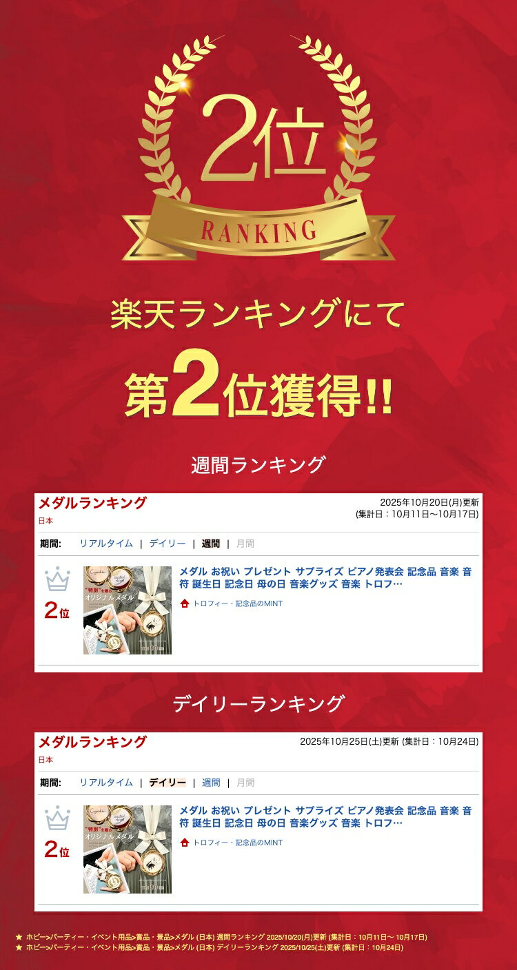 ▽用途・シーン メダル 音楽トロフィー 音符トロフィー オリジナルトロフィー 継続表彰 ピアノ発表会記念 音楽教室記念 ピアノコンクール表彰 音楽コンクール記念 発表会記念トロフィー メダル おしゃれ かわいい 演奏会記念 ピアノ教室卒業記念 音楽教室卒業記念 レッスン修了記念 練習がんばった記念 音楽発表会プレゼント ピアノ生徒向け記念 ピアノ講師記念 ピアノ先生感謝 音楽の先生ありがとう 母の日 サプライズ 結婚 誕生日 お祝い 誕生日プレゼント パーティー メダル ピアノ表彰 音楽賞 演奏賞 優秀演奏者 がんばり賞 努力賞ピアノ 音楽表現賞 特別演奏賞 感動賞 記念コンサート 発表会記念プレート ピアノ名入れ記念 音符モチーフ記念 楽器モチーフ記念 ピアノ発表プレゼント 音楽レッスン記念グッズ イベント記念 名入れトロフィー リボン付きトロフィー 表彰 表彰トロフィー 表彰カップ 表彰状 賞状 表彰アイテム 表彰グッズ 優勝 優勝トロフィー 最優秀賞 最優秀賞トロフィー 努力賞 努力賞トロフィー 功労賞 功労賞トロフィー 表彰式用 表彰記念 感謝状 感謝の盾 オリジナル表彰 名入れ表彰 成績優秀者表彰 コンテスト表彰 表彰大会記念 審査員特別賞 頑張ったで賞 特別賞 表彰贈呈 部活動表彰 団体表彰 個人表彰 表彰記念品 年間表彰 企業表彰 社員表彰 リーダー表彰 生徒表彰 部活表彰 クラス表彰 皆勤賞 精勤賞 ベストパフォーマンス賞 チーム賞 スマイル賞 MVP表彰 ベストリーダー賞 全国大会表彰 入賞 敢闘賞 功績賞 特別功労賞 栄誉賞 団体優勝 個人優勝 ベストパートナー賞 努力の証 成績表彰 出場記念 活動表彰 発表賞 文化賞 学習賞 貢献賞 認定証 技能賞 練習がんばった記念自社製造だからこその、納得の品質・価格! 当店だけのオリジナルデザインです。 New Arrival 栄誉を称えるに相応しい、直径約80mmのボリューム感あるメダル ◆材質 メダル本体/金属製 レリーフ/アクリル製 首掛けリボン/ポリグログラン素材 25mm巾 ◆サイズ メダル本体/直径約80mm 厚さ約10mm ケース/W110×H180×D25mm ◆重量:本体 約255g ケース込み 約370g ◆アクリル製スタンド付き ◆様々なシーンでお使いいただける4種の図柄をご用意 レリーフ部分は艶やかなアクリル素材。 フルカラーUV印刷が施されたオリジナルデザインです。 ◆Excelデータなどのご用意がある場合は、下記アドレスまでデータを添付しメール送信していただいても結構です。athlete@shop.rakuten.co.jp ◆Sサイズの音符トロフィーはこちら♪ ◆Mサイズの音符トロフィーはこちら♪ ◆Lサイズの音符トロフィーはこちら♪ ↓ ガラス製表彰楯も人気です。↓ 関連商品メダル 名入れ 80mm 表彰 メダル ケース プラスチックケース 金...メダル 金銀銅 金メダル メダル 名前入り メダル 野球 サッカー メ...メダル 金銀銅 金メダル メダル 名前入り メダル 野球 サッカー メ...2,980円985円1,580円ピアノ発表会 記念品 お急ぎ対応可 音楽グッズ 音楽 トロフィー 部活...ピアノ発表会 記念品 お急ぎ対応可 音楽グッズ 音楽 トロフィー 部活...子育て感謝状 結婚式 両親 プレゼント お急ぎ対応可 結婚式 両親 贈...2,750円3,550円7,800円結婚式 両親 プレゼント お急ぎ対応可 結婚式 両親 贈呈品 名入れ ...トロフィー ゴルフ お急ぎ対応可 トロフィー 優勝 名入彫刻無料 名...名入れ プレート 文字彫刻無料 お急ぎ対応可 寄贈プレート 名入れ無料...5,800円2,640円770円ピアノ発表会 記念品 お急ぎ対応可 音楽グッズ 音楽 トロフィー 部活...音楽 表彰 盾 楯 ピアノ発表会 記念品 お急ぎ対応可 盾 楯 音楽...盾 音楽 楯 お急ぎ対応可 ピアノ発表会 記念品 音楽 トロフィー 名...3,900円4,800円4,800円