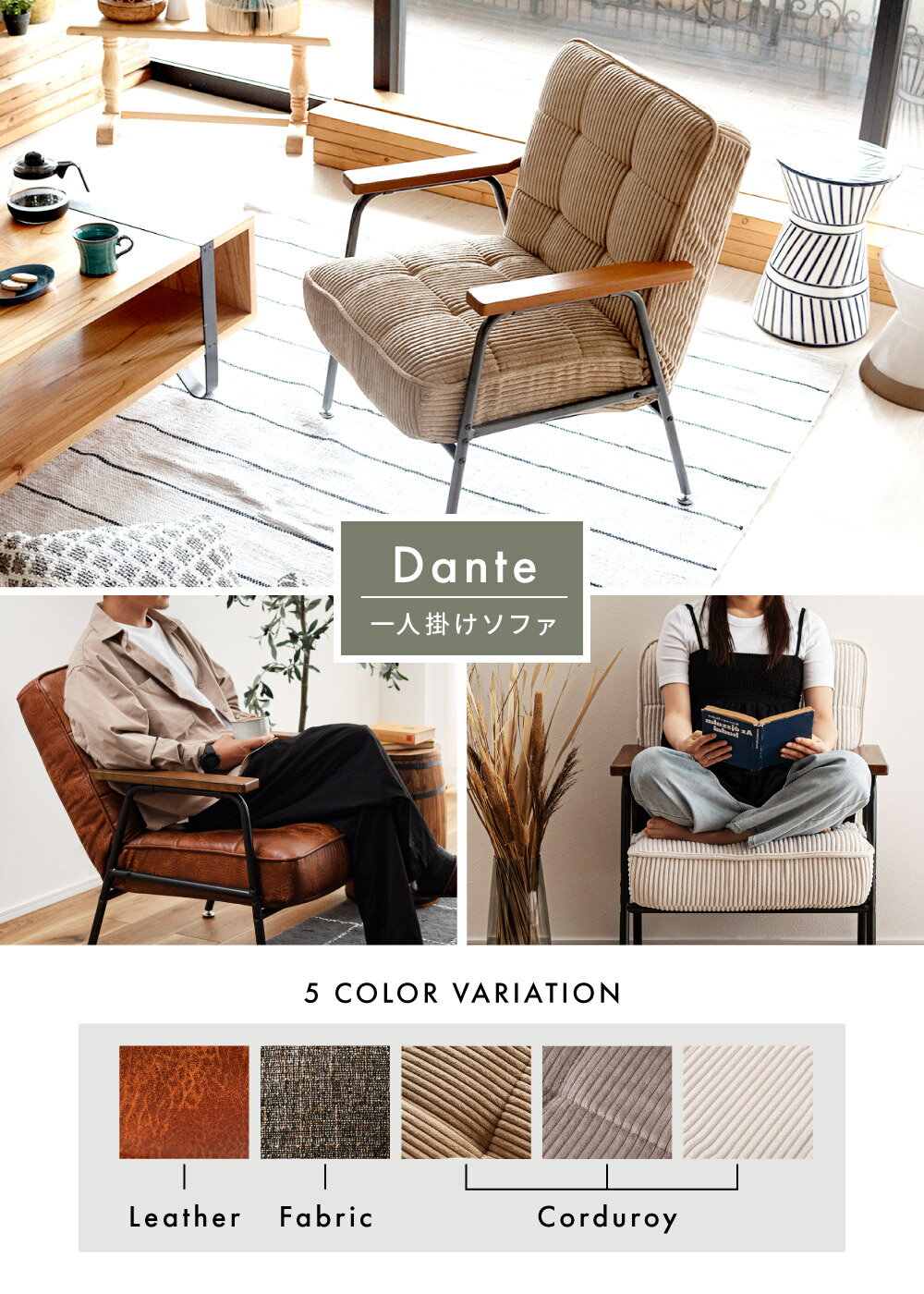 お買い物の前に ≫ よくあるご質問 ≫ 商品説明 ●デザイン シンプルでありながらも洗練されたデザインが魅力のソファ。 スタイリッシュな空間作りをお手伝いします。 ●カジュアルなコーデュロイ生地 「ベージュ」「グレー」「ホワイト」の生地はあたたかみのあるコーデュロイを採用。 手に馴染むような肌触りで、いつまでも撫でていたくなるような心地よさです。 ●豊かな色合いの混色調ファブリック 「ブラウン」の生地は混色調のファブリック素材を採用。 複雑な色の組み合わせがデザインの深みを生み出し、生地そのものがアートのような美しさを持っています。 ●リアルな質感のクロスレザー 「クロスレザー」は、本革や合皮のと遜色ない見栄えで、素材は布と同様のポリエステルです。 本革や合皮は通気性が悪く蒸れやすいですが、クロスレザーは布の仲間なので通気性が良く蒸れにくく快適に座れます。 ●天然木使用の肘掛け 天然木ビーチ材で作られた肘掛けは、美しい木目と風合いが特徴。しっとりと手に馴染み、あたたかみのある雰囲気を醸します。 ※ご注意※ 天然木使用のため、個体差がございます。 自然の特徴としてささくれや色味の違いが生じることがございますがご理解の上でのご購入をお願い申し上げます。 ●どの角度からも美しいデザイン 背面も、表面と同様の素材で仕上げております。 全面にわたる美しいデザインが、空間に洗練された雰囲気をもたらします。 ●快適さ 見た目の部分だけではなく、リクライニング機能やクッション部分の素材、広々設計など機能面にもこだわりました。 ●あぐらもかける広々設計の座面 長時間ソファーに座っていると、姿勢を崩したくなる時も。 女性はもちろん男性でもあぐらをかいてリラックスできるよう、座面幅は56cmと広めに設計しました。 奥行は48cmと、コンパクトながらもしっかりと腰掛けられるサイズ感。 一人暮らしのお部屋や書斎などにもおすすめです。 ●クッション材にポケットコイル使用 コイルはそれぞれ独立して動くため、体圧分散性にすぐれています。 クッションの中材には、ベッドにも使用される「ポケットコイル」を使用。 固すぎず柔らかすぎず、疲れにくい弾力で体を支えてくれます。 ●42段階リクライニング スチール脚のソファには珍しい42段階リクライニング機能付き。 体格や使用シーンなどに合わせて微細な角度調整が可能です。 ●細部について 快適さはクッションだけではありません。 細部にまでわたり快適な使用感を目指しました。 ・錆に強い粉体塗装 粉体塗装は耐久性が高く、塗装が剥がれにくいため、フレーム足が長期間美しく保たれます。 ・アジャスター付き 足先のアジャスターで安定感が保たれ、ラグと床の境目などで少しガタツキが生じる場合でもガタツキにくくなります。 ・脚裏にはフェルト付き アジャスターの底面には床傷防止フェルトが貼られています。そのため、フローリングの上でも安心してお使いいただけます。 ●使い心地重視の生地 コーデュロイ生地もファブリック生地も、どちらもコスト重視ではなく使い心地重視の生地を採用しています。 ・コーデュロイ生地のお手入れ方法 布地をブラッシングし織目のゴミを掻き出します。 その後粘着式クリーナーや掃除機でゴミやホコリを取り除いてください。 ●お掃除簡単 床から座面下までの空間が広いので、ソファを動かさずにお掃除ができます。 ※ご注意※ 天然木使用のため、個体差がございます。 自然の特徴としてささくれや色味の違いが生じることがございますがご理解の上でのご購入をお願い申し上げます。 個体差による返品交換はお受けできかねますので予めご了承ください。ページトップ スペック シリーズ品≫ 2人掛け 商品詳細 サイズ: 幅64×奥行き70〜111×高さ55〜81cm (床から座面までの高さ:43cm) 材 質: スチール(粉体塗装)/ポケットコイル/ポリエステル/ビーチ材 重 量: 約11kg 静的耐荷重: 約80kg 組 立: 組立必要(2人で約20分・六角レンチ付属) 機 能: 42段階リクライニング 送 料:送料無料 ※北海道・沖縄・離島へのお届けは別途送料が加算されます。 検索キーワード: ソファ ソファー 1人掛け 一人用 一人暮らし おしゃれ コーデュロイ ファブリック リクライニング リクライニングチェア ポケットコイル スチール脚 肘あり ひじ掛け アームレスト ヴィンテージ アメリカン インダストリアル ベージュ かわいい ●デザイン シンプルでありながらも洗練されたデザインが魅力のソファ。 スタイリッシュな空間作りをお手伝いします。 ●カジュアルなコーデュロイ生地 「ベージュ」「グレー」「ホワイト」の生地はあたたかみのあるコーデュロイを採用。 手に馴染むような肌触りで、いつまでも撫でていたくなるような心地よさです。 ●豊かな色合いの混色調ファブリック 「ブラウン」の生地は混色調のファブリック素材を採用。 複雑な色の組み合わせがデザインの深みを生み出し、生地そのものがアート