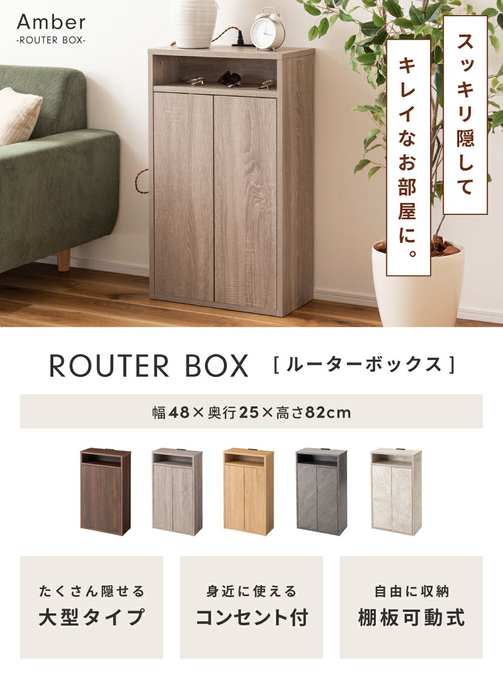 お買い物の前に ≫ よくあるご質問 ≫ 商品説明 ●スッキリ隠してキレイなお部屋に。 ●ルーター類の『ごちゃつき』も、まとめてスッキリ収納 ●コンパクトでも収納力は抜群 コンパクトな見た目ながら、大きめのルーター・配線・電源タップなどたっぷりと収納できます。 ●高さ調節可能な棚板で自由に収納 中央の棚板2枚は、約6cmごとに7段階で高さ調節が可能です。 ご自宅のルーターのサイズや、収納したいアイテムに合わせて自由に変えることができます。 ●よく使用するものは天板のコンセントへ スマホの充電など、頻繁に抜き差しするものは天板のコンセントが便利です。 スライドカバー式なので、使わない時にほこりや湿気が入らず安心です。 ●プッシュ式の扉で見た目スッキリ ●暖かみのある木目調のデザイン メーカー希望小売価格はメーカーカタログに基づいて掲載していますページトップ スペック 商品詳細 サイズ:幅48×奥行25×高さ82cm 商品重量:約16.5kg 材 質:メラミン化粧繊維板/2口コンセント 組 立:組み立て必要(ドライバー付属) 送 料:送料無料※北海道・沖縄・離島へのお届けは別途送料が加算されます。・配達地域や交通事情等により、希望配達日時にお届けができない場合がございます。予めご了承ください。 ルーター類の『ごちゃつき』も、まとめてスッキリ収納 ●コンパクトでも収納力は抜群 コンパクトな見た目ながら、大きめのルーター・配線・電源タップなどたっぷりと収納できます。 ●スリムな幅48cm×奥行25cm お部屋のどこに置いても邪魔になりにくく、家具と家具の間などちょっとした空間に設置することも可能です。 ●約6cmごとに7段階高さ調節できる棚板2枚 ・棚はプラグを通せるコードスリット仕様 ・ダボで気軽にに固定・高さ調節 ●身近なものは天板のコンセントへ スマホの充電など、頻繁に抜き差しするものは天板のコンセントに。 スライドカバー式のため、使わない時にほこりや湿気が入らず安心です。 ●背面オープン&スキマで配線しやすい 背面は1cmほど隙間が空く仕様となっているため、コードを外に出しやすいです。 背面がオープンになっていることで熱がこもりにくいというメリットも。 ●自分に合った用途が見つかる天板 お好みの雑貨を飾ったり、ソファ横のサイドテーブルとして。 高さ82cmと高めの設計なので、電話台などにもぴったりです♪ ●お部屋を彩るリアルプリント まるで本物の天然素材のようなリアルな木目・石目模様が重厚感を漂わせます。 ◎お手入れ簡単なメラミン化粧板 ※こちらの製品は組み立て式です※ 組立手順の多い製品です。組み立てる前に説明書をしっかりとご確認いただきますようお願い申し上げます。