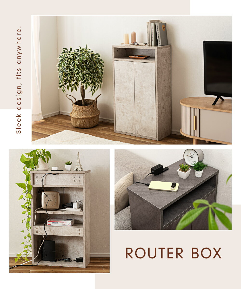 ルーターボックス ケーブルボックス ボックス 収納 隠す ケーブル収納 ルーター収納 可動棚 コードスリット コンセント付き コンセント リビング 寝室 木製 木目 北欧 モダン シンプル ブラウン ナチュラル ベージュ グレー グレージュ