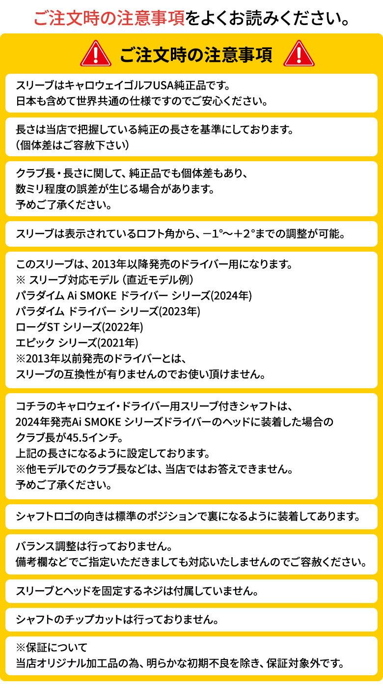 この商品の特徴即日出荷▲VENTUS TR BLUE カーボンシャフトロフト角・ライ角 早見表【ドライバー編】世界中のトッププロから信頼を勝ち得た安定性を次のレベルに優れたボールコントロール性能を実現した「VelocoreTechnology」がさらに進化。最外層に開繊クロス材を採用することにより、中間部の剛性を高め、さらなる安定性を追求。ツアーからのフィードバックをもとに生まれた新しいVENTUSの誕生です。製品特長VeloCore Technology既存VENTUS BLUEと同じくVeloCore Technologyを搭載。超高弾性70tカーボンと高弾性カーボンをバイアス層に積層することで、オフセンター時のヘッドの捩れを抑制し、優れたボールコントロール性能を実現しています。さらに、シャフト先端の高い曲げ剛性がボール初速の最大化を生み出しています。SPREAD TOW FABRIC最外層に独自の開繊クロス材を採用。中間部の捩れと曲げの剛性を高める事により、VeloCoreテクノロジーの最大の効果である球の散らばりを抑制することをさらに向上させています。グリップ・スリーブ▲ゴルフプライド360ラバーグリップ▲スリーブ対応クラブ・PARADYM Ai SMOKE MAX Driver・PARADYM Ai SMOKE MAX D Driver・PARADYM Ai SMOKE ◆◆◆ Driver・PARADYM Driver・PARADYM X Driver・PARADYM ◆◆◆ Driver・GREAT BIG BERTHA Driver(2022)・ROGUE ST MAX Driver・ROGUE ST MAX D Driver・ROGUE ST MAX LS Driver・EPIC SPEED Driver・EPIC MAX Driver / EPIC MAX LS Driver・BIG BERTHA Driver(2020)・MAVRIK Driver / MAX Driver / Sub Zero Driver・EPIC FLASH sub Zero Driver・EPIC FLASH Driver・ROGUE Sub Zero Driver/ROGUE Driver・GBB EPIC Sub Zero Driver/FW・XR16 Driver・XR PRO 16 Driver(2016)・BIG BERTHA ALPHA 816 ◆◆ Driver/FW(2015)・GREAT BIG BERTHA Driver/FW(2015)・XR Driver・XR PRO Driver(2015)・BIG BERTHA ALPHA 815 ◆◆ Driver(2014)・BIG BERTHA ALPHA 815 Driver/FW(2014)スペックシャフト名VENTUS TR BL 5VENTUS TR BL 6VENTUS TR BL 7硬さRSSXSX装着長さ(インチ)※注意事項をお読みください。重量(g)5858686877.578.5トルク3.53.33.12.92.92.7Tip径8.5Butt径15.415.415.415.415.415.4調子中元原産国ベトナム適合モデル2013年以降発売モデルのウッド用Tip径335グリップ名ツアーベルベットラバー 360コアサイズM60R標準重量±50g原産国タイ※長さはヘッド装着時の純正のクラブ長に合わせた長さなります。※シャフト重量はカタログ値になります。※シャフトのロゴ向きはスタンダードポジションで裏になります。※シャフトやロゴの向き、長さには若干の個体差が出る可能性がございますのであらかじめご了承ください。