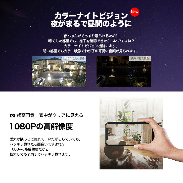 専用アプリ「ATOM - スマートライフ」(無料)を使い簡単にセットアップしてご利用いただけます。※専用アプリはiOS 9.0以上、Android 8.0以上対応※Wi-Fi 2.4GHz帯に接続する必要があります。※防水効果を発揮するため、電源供給は必ず付属の専用USBケーブルをご利用ください。