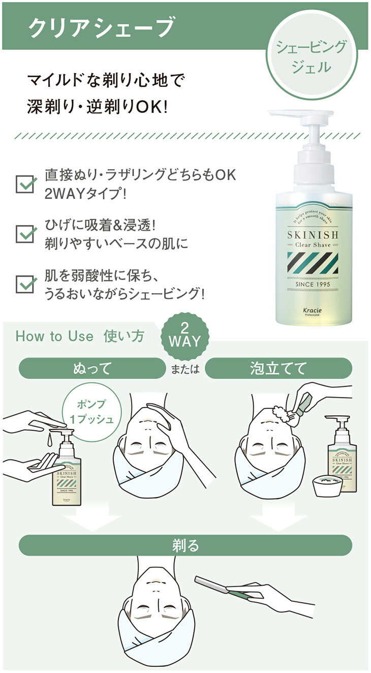商品名 クラシエ スキニッシュ クリアシェーブ 商品説明 「クラシエ スキニッシュ クリアシェーブ」は、マイルドな剃り心地で深剃り、逆剃りができるシェービングジェルです。直接ぬり・ラザリングどちらもOKの2WAYタイプです。ひげに吸着&浸透し、剃りやすいベースの肌に導きます。肌を弱酸性に保ち、うるおいながらシェービング! スキニッシュとは ケアしながら、剃る。 弱酸性シェービングシリーズ。 「気持ちがよくて思わず眠ってしまった」「自分で剃るのとは全然違う」「肌がツルツルに」そんな声を、もっと聞きたいから。「SKINISH(スキニッシュ)」は、“理容師のシェービング技術が活きる”弱酸性シェービングシリーズ。お客さまの肌をシェービングしやすい状態にすることで、お客さまの肌への負担を軽減するとともに、技術者の剃りやすさもサポート。さらに、保湿効果の高いユズセラミドEX(※1)と6種類の西洋ハーブエキス(※2)が肌をしっかりと潤して整え、ワンランク上の心地よい剃り上がりへ。香りは、リラックスできる時間を演出する爽やかなマイルドシトラス。すべては、お客さまとプロにとって、快適なシェービングのために。 ◎特長 ・全品弱酸性 ・リラックスできる微香性のマイルドシトラスの香り ・シンプルな使用ステップでプロの技術をサポート (※1)ユズセラミドEX〔ホップ花エキス、ユズ果実エキス、アロエベラ葉エキス〕(保湿成分) (※2)6種類の西洋ハーブエキス〔ブドウ葉エキス、セイヨウオトギリソウ花/葉/茎エキス、アルニカ花エキス、ハマメリス葉エキス、セイヨウキズタ葉/茎エキス、セイヨウトチノキ種子エキス〕(保湿成分) 3つのポイント ◎Point.1 全品弱酸性・保湿成分配合 健康な肌は弱酸性。全品弱酸性のスキニッシュは肌を弱酸性に保ちながら剃ることができ、保湿効果の高いユズセラミドEX・6種類の西洋ハーブエキスがうるおいあふれる肌に整えます。 微香性の爽やかなマイルドシトラスの香りでリラックスできる施術を演出します。 ◎Point.2 プロの技術をサポート スキニッシュはお客様の肌をシェービングしやすい状態にすることで、技術者の剃りやすさをサポート。 お客様の肌の負担を軽減し快適なシェービングへと導きます。 ◎Point.3 使い方簡単 特別な器具や技術の必要がなく、シリーズ使いをすることによりお客様の肌をケアしながら心地よいシェービングとしてサロンの看板メニューへとバージョンアップができます。 また、単品でも導入していただけます。 内容量 1000ml 使用上の注意 頭皮に異常が生じていないかよく注意してご使用ください。 頭皮に異常がある時、またはお肌に合わない時は、ご使用をおやめください。 体質に合わない場合は、利用を中止し医師に相談して下さい。 直射日光の当たる場所、極端に高温や低温になる場所には保管しないでください。 乳幼児の手の届かないところに保管してください。 効果・効能については、個人差がございます。 広告文責 株式会社リライフコーポレーション tel:0595-44-6127 メーカー クラシエ 区分 化粧品 / 日本製マイルドな剃り心地で、深剃り・逆剃りOK! 「クラシエ スキニッシュ クリアシェーブ」は、マイルドな剃り心地で深剃り、逆剃りができるシェービングジェルです。直接ぬり・ラザリングどちらもOKの2WAYタイプです。ひげに吸着&浸透し、剃りやすいベースの肌に導きます。肌を弱酸性に保ち、うるおいながらシェービング! SKINISH ~スキニッシュシリーズ~ 【ケアしながら、剃る。弱酸性シェービングシリーズ。】 「気持ちがよくて思わず眠ってしまった」「自分で剃るのとは全然違う」「肌がツルツルに」そんな声を、もっと聞きたいから。「SKINISH(スキニッシュ)」は、“理容師のシェービング技術が活きる”弱酸性シェービングシリーズ。お客さまの肌をシェービングしやすい状態にすることで、お客さまの肌への負担を軽減するとともに、技術者の剃りやすさもサポート。さらに、保湿効果の高いユズセラミドEX(※1)と6種類の西洋ハーブエキス(※2)が肌をしっかりと潤して整え、ワンランク上の心地よい剃り上がりへ。香りは、リラックスできる時間を演出する爽やかなマイルドシトラス。すべては、お客さまとプロにとって、快適なシェービングのために。 ◎特長 ・全品弱酸性 ・リラックスできる微香性のマイルドシトラスの香り ・シンプルな使用ステップでプロの技術をサポート (※1)ユズセラミドEX〔ホップ花エキス、ユズ果実エキス、アロエベラ葉エキス〕(保湿成分) (※2)6種類の西洋ハーブエキス〔ブドウ葉エキス、セイヨウオトギリソウ花/葉/茎エキス、アルニカ花エキス、ハマメリス葉エキス、セイヨウキズタ葉/茎エキス、セイヨウトチノキ種子エキス〕(保湿成分)