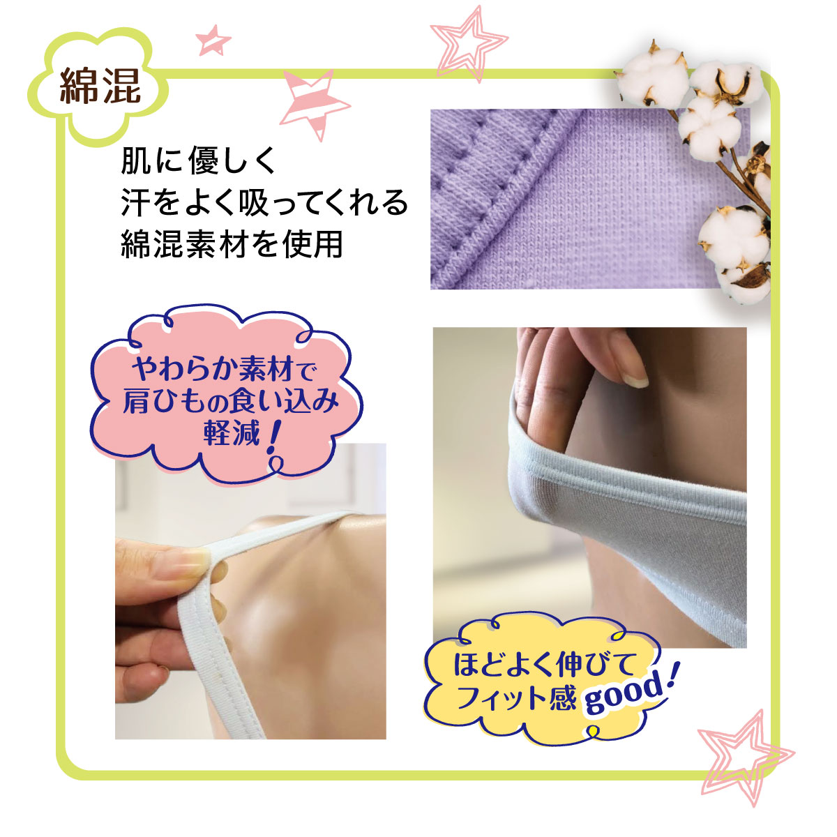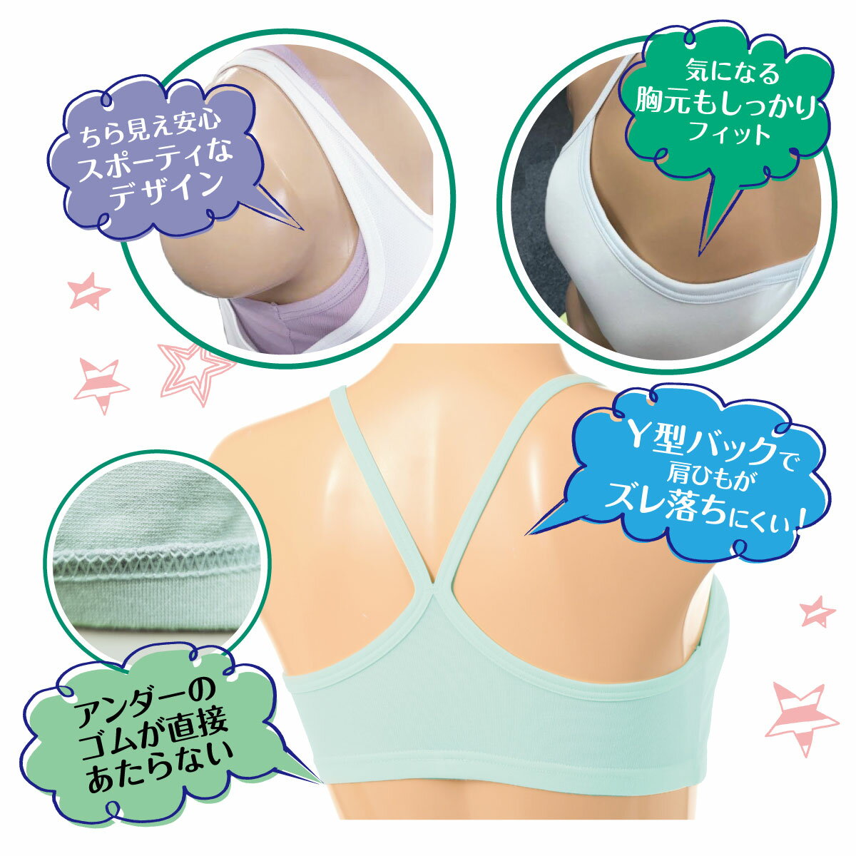 ■このブランドについて [ブランド名]ステップフィット! [ブランドのコンセプト]〜STEP FIT(ステップフィット)〜体育や部活、ダンスなどの習い事に最適!アクティブな小中学生の部活やスポーツに対応したインナーシリーズ。 ■この商品について かわいいカラーとシンプルなデザインで、アウター感覚で着れるので見えても気にらないジュニアブラ♪ さらに、こだわりの素材と機能で、動きにしっかりフィット! バストトップが気になってきたお子様のはじめてブラや、普段使い、スクール用に幅広くご利用いただけます! ※こちらの商品は品番92000ASの後継品番です。 【POINT.1】アクティブに動いてもズレにくい ・背中側がY型バックになっており、肩甲骨にストラップが当たらず腕の動きを妨げません。腕を大きく動かしてもストラップがずれ落ちにくいので、激しく動くスポーツシーンや、なで肩のお子さまにもおすすめです。身生地は伸縮性のあるベア天竺素材を使用しており、思いっきり動いても身体にしっかりフィットします。 【POINT.2】綿混素材&こだわりの設計 ・肌触りがやさしく、汗をしっかり吸収してくれる綿混素材を使用しています。肩紐ストラップも同じ綿混素材のため、やわらかな肌あたりで食い込みや不快感を軽減します。背中までぐるっとサポートするアンダーゴムは、身生地で折り返し袋縫いにすることで、直接肌にあたらないように仕上げています。さらに、胸元の開きを浅めに設計することで、前かがみになっても安心して着用いただけます。 【POINT.3】いつでも清潔!汗のにおいが気にならない ・生地には細菌の繁殖を抑制する抗菌防臭加工と、ニオイの発生を抑制する制菌加工 (Ag+ 銀イオン)を施しています。たくさん運動をして汗をかいても、いつでも清潔に爽やかな着心地を保ちます。 【POINT.4】パッド取り外しOK!お手入れも楽ちん ・内蔵されたパッドは取り外しできるので、お子さまの成長や体形、着用シーンに合わせて調整して長くご使用いただけます。 パッドを外せるのでお洗濯しても乾きやすく、部屋干し臭を抑える抗菌防臭加工もあわせて、お手入れが楽になる嬉しいポイントです。縫製もダブルステッチで仕上げており、繰り返し洗濯してもほつれにくい丈夫さも魅力です。 【POINT.5】豊富なカラー展開&シンプルなデザイン ・ブラックやグレーなどのベーシックなカラーと、ダンスの衣装や普段の洋服でもコーディネートが楽しめるパステルカラーを展開。学校用にベーシックカラー、習い事や普段用にパステルカラーなど、カラー違いで複数揃えたい万能アイテムです。シンプルなデザインなので、チラ見えしても恥ずかしくなく、あえて肩ストラップを見せてオシャレを楽しむなどいろんな場面で着用いただけます! 種別:スポーツブラ サイズ:SS/S/M/L カラー:グレー(19)/オフホワイト(454)/ブラック(491)/ラベンダー(625)/スイートピンク(693)/ミント(822) 特徴:綿混ベア天竺/取り外し可能パッド付/制菌加工(Ag+銀イオン)/抗菌防臭加工/SEKマーク付/吸汗速乾加工/UVカット 素材:綿/ポリエステル/その他 生産国:中国 \今売れてます!当店のおすすめタイツ/ ▼40・80・120デニールの豊富な展開♪着圧タイツ ▼暖かいのに着ぶくれしない♪ふわふわ裏起毛の320デニールタイツ ▼2枚合わせで重ね履きのような暖かさ♪パンプスにも◎なWニットタイツ ▼足汗による足元の冷えを予防!選べる3色・80デニールの5本指タイツ ▼通気性よくムレを解決♪選べる2色・80デニールのパンティ部レスタイツ \イチオシ!秋冬のおすすめアイテム/ ■売れてます!寒い季節もヒップアップとお腹おさえを♪ガードル一体型レギンスは★こちら★ ■売れてます!3分丈で防寒も叶う♪一枚履きOKな骨盤ホールド×ヒップアップガードルは★こちら★ ■新発売!暖かフィットで美ラインに!アスティーグ暖から吸湿発熱インナー登場♪は★こちら★ ■売れてます!24時間ほどよくバストキープ!1日中快適に過ごせるナイトブラは★こちら★ ■売れてます!締め付けが苦手な方にもおススメ♪やみつきになる肌心地のナイトブラは★こちら★ ■売れてます!暖房で汗をかいても安心♪脇のパッドで汗ジミをガードする 透けにくいインナーは★こちら★ ■売れてます!揺れからバストを守る!冬に嬉しいメッシュ素材のさらっと吸汗速乾スポブラは★こちら★ ■使いやすいカラー展開が魅力!自分らしいスタイルが叶うレッグウェアブランドが新登場♪は★こちら★ \キッズ&ジュニアの関連アイテムはこちら!/ ■アツギのジュニアインナーは★こちら★ ■アツギのスクールソックス、スパッツは★こちら★