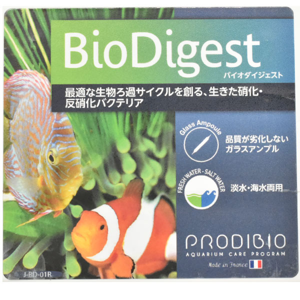 ガラスアンプルに詰められた使いきりタイプのバクテリアですのでクオリティーの高いバクテリアを常に添加できます (淡水・海水両用)【効果】・ 素早く水質の安定を行うため、より早く水槽に魚を導入することができます。 ・亜硝酸塩、リン酸塩を減少させ、水の透明度を保ち、水槽内に藻の広がりを防ぎます。・病原菌の広がりを防ぎ、病気に対するリスクを減少させます。・バイオダイジェストの浄化作用は、姉妹品のバイオトレース、バイオプティムを併用することでより効果を高めることができます。 【バイオダイジェストを使用するタイミング】・水槽の新規セット時・亜硝酸塩が高濃度になった時・フィルター清掃後・魚の数が増えた時・水槽内が汚れている時・不快なにおいがある時・水が濁っている時・藻が増殖している時・魚が不可解に死亡した時【使用方法】・新規水槽セット時:60リットルに1アンプル・それ以外の使用時:2週間に1回、60〜1000リットルに1アンプルAQ-3 【関連商品】 ・ジェックス サイクル 500ml ・バイコム スーパーバイコム21PD 淡水用 110ml ・バイコム スーパーバイコム21PD 海水用 110ml ・バイコム スーパーバイコム78 海水用 110ml ・バイコム スーパーバイコム78 淡水用 110ml ・バイコム バイコムバフィ 30ml 1本入り 検索ワード:probio