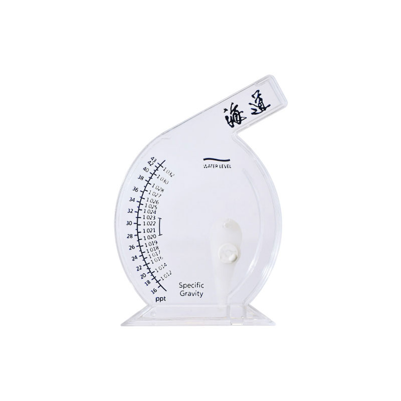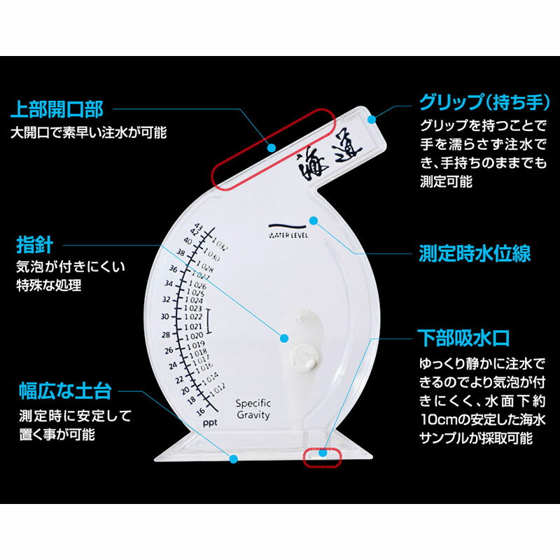 すばやく、正確に測定! これまでわずらわしさを感じていた”指針に気泡が付着するせいで何度もやり直す”手間を軽減するため、多くの工夫を施した比重計です。 製品の特徴 大きな開口部と採水ルートの工夫、指針に気泡が付きにくい処理により、スピーディーかつ正確な測定が可能となっています。 製品仕様 製品名 海道 比重計 用途 観賞魚用海水比重計 推奨温度範囲 20〜27℃(基準温度:25℃) 本体サイズ 約95×143×22mm 本体重量 約75g 材質 PS 原産国 台湾 使用上の注意 本品は20〜27℃の測定に適していますが、比重は水温によって変化しますので予めご了承ください。 指針に気泡が付着していると比重を正しく測定できません。 本品は気泡付着を低減する加工を施しておりますが、それでも付着する場合があります。 その場合、本体を軽く振るか、細長い棒でやさしくつつくなどして気泡を取り除いてください。 あまりにも多くの気泡が付着した場合は一度排水してから再度注水してください。 指針に塩分が付着していると正しく測定できませんのでご注意ください。 指針への塩分の付着を防ぐため、使用の前後は必ず真水で洗ってください。 洗剤や熱湯、酢、アルカリなどで洗うと正確な測定ができなくなる可能性がありますので避けてください。 本製品使用時における生体の病気や死亡、海藻や海草の枯れなどについての保証は一切致しかねます。 あらかじめご了承ください。 本品の再校正はできません。 長期使用の際、測定結果に少しずつ誤差が生じてくる場合があります。 落下など、外からの強い衝撃を受けると正しく測定できなくなる可能性があります。 本品を廃棄する場合は自治体が定める区分に従って適切に処分してください。