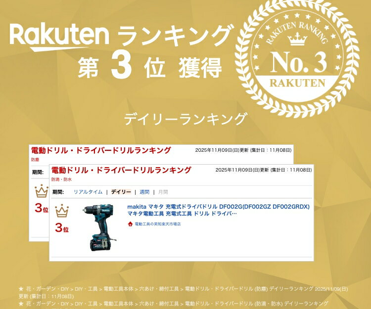■メーカー希望小売価格はメーカーカタログに基づいて掲載しています ■後払い決済がご利用可能です。 makita マキタ 充電式ドライバドリル DF002G(DF002GZ DF002GRDX) セット内容 ■単品(DF002GZ) :本体のみ※別売りのバッテリ・充電器が無いと使用できません ■セット(DF002GRDX):本体・バッテリ BL4025(2.5Ah)×2本・充電器(DC40RA)約19分(実用充電)約28分(フル充電)・ケース 商品説明 ■ミドルクラス最速穴あけ※1、高速回転2,200min-1 木工穴あけスピード約30%アップ(当社18V機比)※2 ※1 国内ミドルクラス充電式ドライバドリルにおいて。2020年11月現在、当社調べ。 ※2 木工キリφ27mm、ラワン厚さ30mm時 ■高耐久オールメタルギヤ+ハイパワーブラシレスモータ搭載 最大トルク65N・m ■定回転制御 バッテリ残容量や負荷に左右されにくく、安定した穴あけが可能。 ■防水保護等級IPX6※ 本機はもちろん、バッテリも対応。 ※粉じんや水による影響を受けにくいように 設計されていますが、故障しないことを保証するものではありません。バッテリを装着した場合は、本体側の保護等級に準じます。 ■コンパクト&軽量 全長164mmのコンパクトボディ(当社18V機比-8mm)&軽量1.9kg。 ■防じん・防水IP65仕様※プラスチックケース(小物入れ収納部除く) GRDX標準付属。 ※粉じんや水による影響を受けにくいように 設計されていますが、故障しないことを保証するものではありません。 ■鉄工穴あけに(φ13mm) ■スパイラルステップドリルで配電盤のボックス穴あけに ■タップドリルでネジ切りに 様々な先端工具に対応。 ■その他特長 ■防滴・防じん「アプト」■高速・低速2スピード■高輝度LEDライト(2灯式)■無段変速■正逆転両用■ブレーキ付 ■40Vmaxバッテリは豊富な互換性 インパクトドライバ、ハンマドリル、マルノコ、レシプロソー、ディスクグラインダなどに共通使用可能。 商品仕様 ■モデルNo DF002G ■最大穴あけ能力(mm) 鉄工 13 / 木工 38 ■ネジ締め能力(mm) 木ネジ φ10×90 ■ネジ締め能力 小ネジ M6 ■最大トルク(N・m) 65 ■チャック能力(mm) 1.5~13 ■回転数(min-1)[回転/分] 高速 0~2,200 / 低速 0~600 ■電源(V) 直流36(40Vmax) ※電源の補足 ※40Vmaxは満充電時のバッテリ電圧を表しています。 ■1充電作業量(目安) 木工キリ(ラワン) φ15mm 約960本 (30mm厚) ※1充電使用量(目安)の補足 ※数値は参考値です。バッテリの充電状態や作業条件によって異なります。 ■本機寸法(mm) 長さ:164幅:86高さ:265 ■質量(kg) 1.9 ※質量の補足 ※バッテリ含む ■標準付属品 (+)ビット2-65 / フック ■機能 ハイパワーブラシレスモータ ○ パワー切替 2段階 防じん・防水 APT IPX6(バッテリIP56) クラッチ 21段階 LEDライト ○ ■推奨バッテリ BL4020 ◎ BL4025 ◎ BL4040 ◎ BL4040F ◎ BL4050F ○ BL4080F ○ ※推奨バッテリの補足 ◎:推奨/〇:使用可 尚、商品の販売を終了または停止している場合は検索しても見つからない場合がございます。 ご了承ください★ 注意事項当店では店頭販売も兼ねており、在庫が完売してしまう場合がございます。場合によりお待たせしてしまう可能性がありますのでお急ぎの場合は事前に納期の確認をお願い致します。尚、発送および納期確認は平日にしかできませんので、悪しからずご了承ください。 マキタ純正充電器及びマキタ純正電池には「PSEマーク」が表示されております。 届出事業者名 株式会社マキタ 関連キーワード makita マキタ 充電式ドライバドリル DF002G(DF002GZ DF002GRDX) マキタ電動工具 充電式工具 ドリル ドライバ ドライバドリル 40V 40Vmax 65N・mミドルクラス最速穴あけ※1、高速回転2,200min-1 木工穴あけスピード約30%アップ(当社18V機比)※2 ※1 国内ミドルクラス充電式ドライバドリルにおいて。2020年11月現在、当社調べ。 ※2 木工キリφ27mm、ラワン厚さ30mm時 ※写真は木工穴あけφ38mm 高耐久オールメタルギヤ+ハイパワーブラシレスモータ搭載 最大トルク65N・m(写真はHP002Gです) 定回転制御 バッテリ残容量や負荷に左右されにくく、安定した穴あけが可能。 防水保護等級IPX6※ 本機はもちろん、バッテリも対応。 ※粉じんや水による影響を受けにくいように 設計されていますが、故障しないことを保証するものではありません。バッテリを装着した場合は、本体側の保護等級に準じます。 コンパクト&軽量 全長164mmのコンパクトボディ(当社18V機比-8mm)&軽量1.9kg。 防じん・防水IP65仕様※プラスチックケース(小物入れ収納部除く) GRDX標準付属。 ※粉じんや水による影響を受けにくいように 設計されていますが、故障しないことを保証するものではありません。 鉄工穴あけに(φ13mm) スパイラルステップドリルで配電盤のボックス穴あけに タップドリルでネジ切りに 様々な先端工具に対応。 (写真はHP002Gです) その他特長 ■防滴・防じん「アプト」■高速・低速2スピード■高輝度LEDライト(2灯式)■無段変速■正逆転両用■ブレーキ付 40Vmaxバッテリは豊富な互換性 インパクトドライバ、ハンマドリル、マルノコ、レシプロソー、ディスクグラインダなどに共通使用可能。