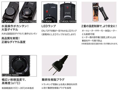 商品説明 ■コトブキ パワーサーモ ET-300X 本製品は、観賞魚ヒーターをコントロールするためのサーモスタットです。 【特長】 ・電子制御式サーモスタット ・パワーのON/OFF状態がLEDランプで一目でわかる。 ・温度設定がしやすく操作簡単大型ダイヤル採用。 ・発火事故を未然に制止。難燃性樹脂プラグ採用。 ・精度±1℃。高感度センサー採用。 ・器具の誤作動を防ぐ耐ノイズ設計。 ・1年間保証書付。(海水:6ヶ月) ●オートヒーターとの接続可能 ※オートヒーターが26℃固定の場合は制御温度は26℃までです。 【仕様】 定格消費電力:2.6W (50/60Hz共通) 制御範囲:約19℃〜31℃ 温度センサー精度:±1℃ ヒーター用コンセント:1口 ヒーター容量:2〜300Wまで
