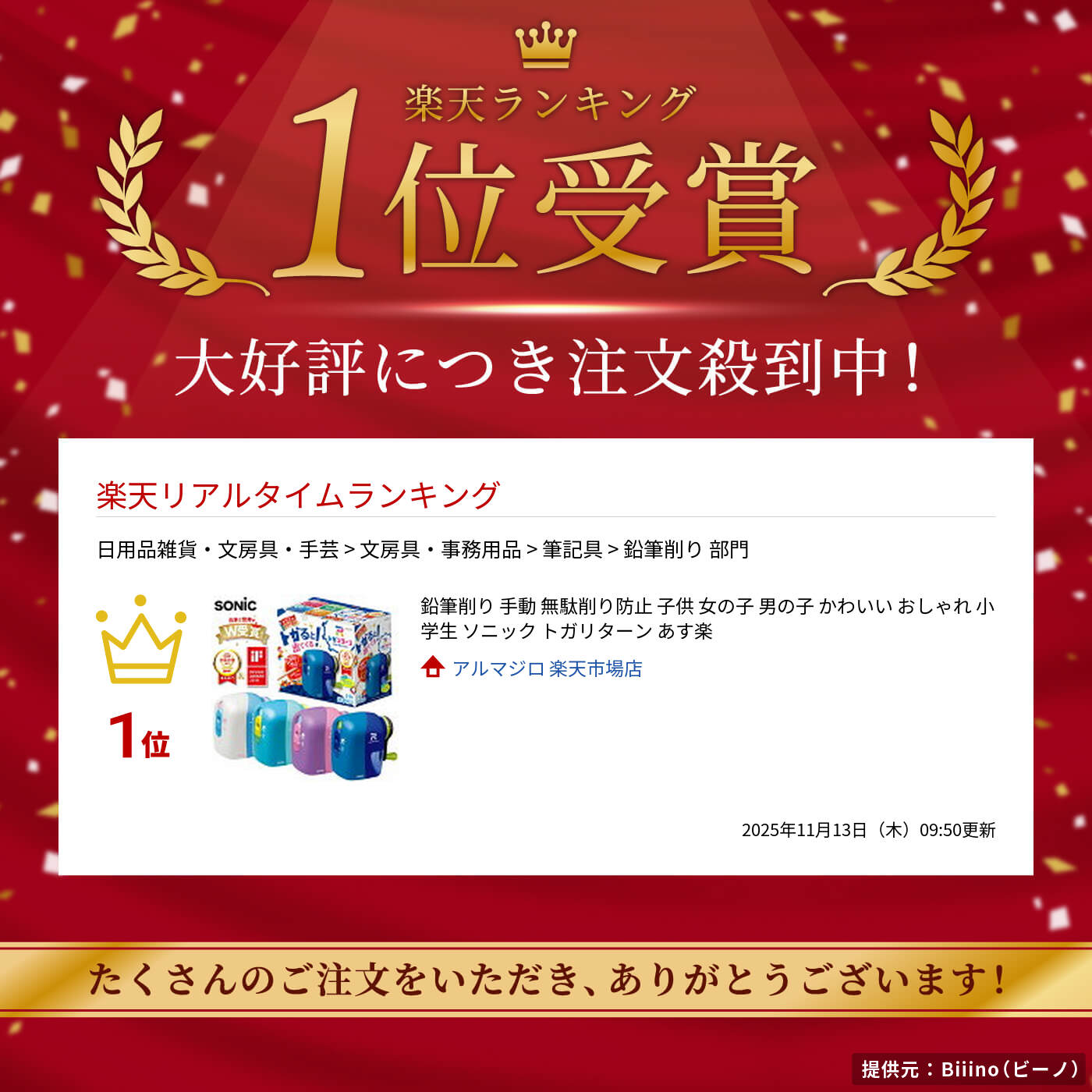【特徴】 ・夢あるモノづくりがモットーの「ソニック」製 ・日本文具大賞(2017年)、iFデザイン賞(2018年)受賞商品 ・特許!新開発機構で鉛筆がトガると出てくる! ・削り上がると鉛筆が排出される「リターン式ムダ削り防止」で、従来品より飛躍的にムダ削りを防止! ・操作は今までよりも簡単!鉛筆を挿して、ハンドルを回すだけ! ・ダストケース安心ロック機構で、倒れても削りかすがこぼれません♪ ・大容量ダストケース(当社従来比2倍) ・六角・三角・丸型の3種類の鉛筆に対応しています。 ・鉛筆を差すだけ、指を挟まない安全タイプ 【仕様】 サイズ:84×121×141mm 材質:本体=ABS、ダストケース=PS