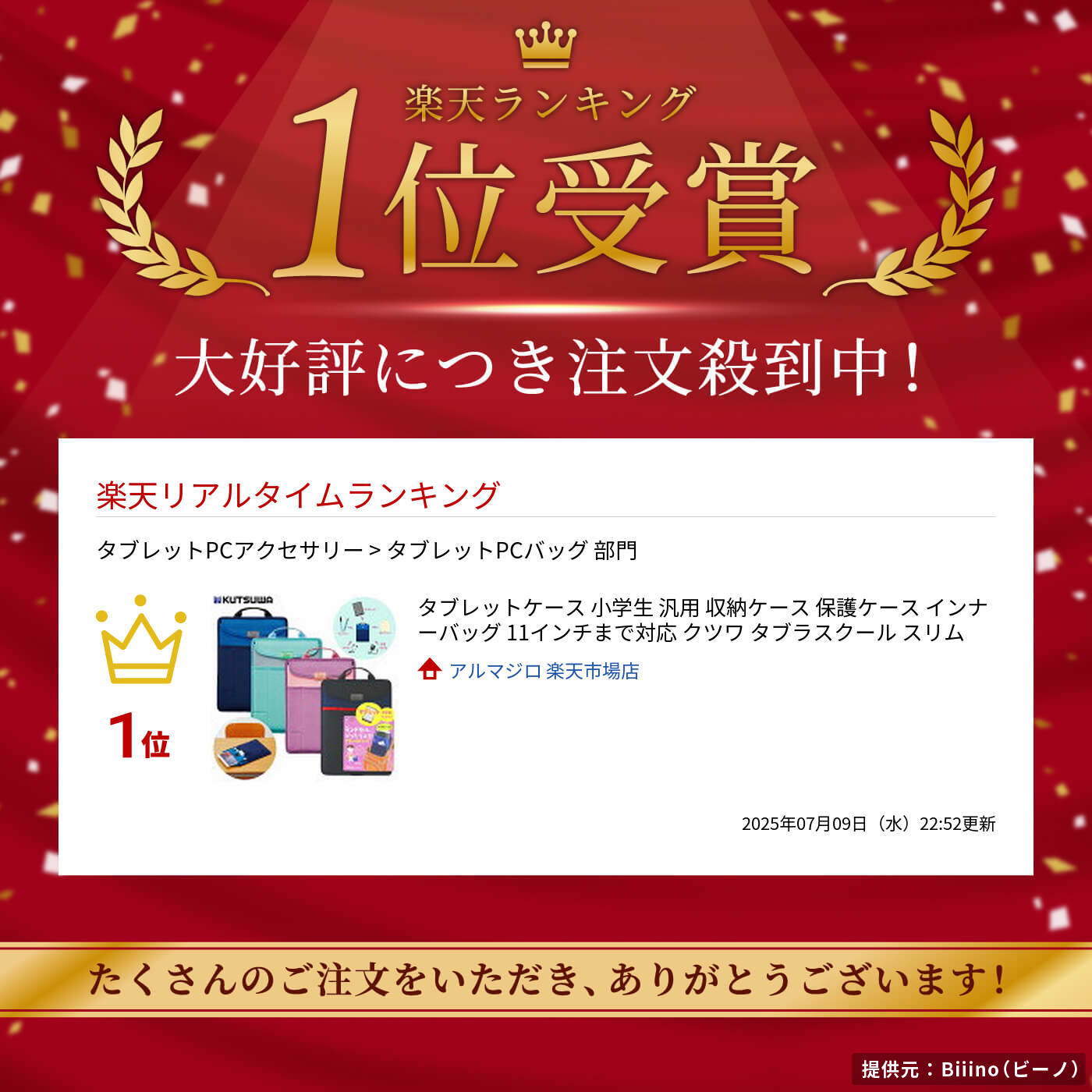 【特長】 ・文具一筋創業110年の老舗「クツワ」製 ・ランドセルにぴったり入る!タブレット用ケース ・前ポケットに充電ケーブル・タッチペン・イヤホン等が入り、背面はファイル仕様になっておりB5サイズのプリントやノートも入れられる ・授業に必要な物がまとまるから忘れ物や紛失を防ぐことができて安心 ・硬質の本体縁部分が落下時の衝撃を和らげる ・持ち手付きで、力の弱い子供でもランドセルへの出し入れがしやすく、持ち運びにも便利(耐荷重3kg) ・本体生地は機器に優しい厚手クッション素材 【仕様】 収納可能タブレットサイズ:H250×W200×D13mm 以内 サイズ:H310×W223×D10mm(持ち手除く) 重量:240g 材質:ポリエステル、SBRゴム、PP、合成皮革