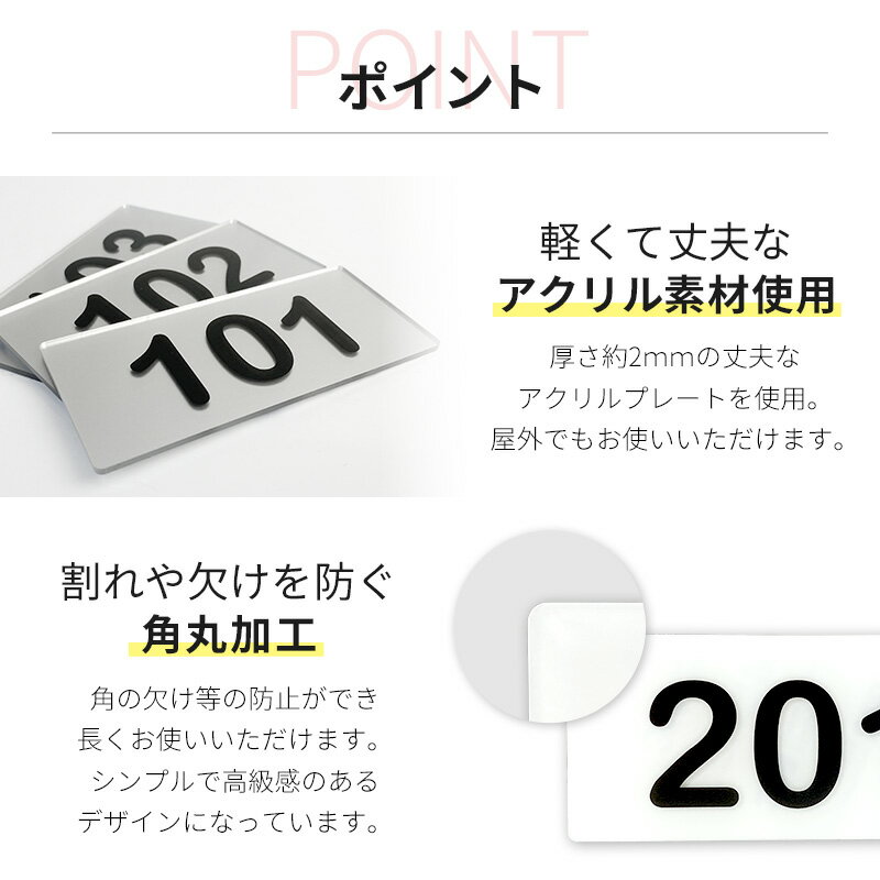 Anvis アンビス ルームナンバー 部屋番号 ルーム サイン プレート 室名 室名札 表札 長方形 横長 角丸 45mm×100mm 101 102 103 201 202 203 マンション アパート 賃貸 集合住宅 ホテル 寮 集合ポスト ドア 扉 宅配ボックス 見やすい 貼るだけ 取付簡単 強力 両面テープ式 誤配防止 屋内 屋外 クリア 透明 アクリル シルバー ホワイト 銀 白 防水 耐水 おしゃれ シンプル オーダー商品説明 アパート・マンション・ポスト・ロッカー・ホテルなどに! シンプルで見やすいデザインのルームナンバープレートです。 軽くて丈夫なアクリル製でできており、屋外でもお使いいただけます。 角丸加工で角が欠けにくくなっています。 強粘着な両面テープ付きで簡単に取り付けることができます! ※表面の保護フィルムを剥がしてご使用ください。 ご注文時に選択いただけるナンバー以外は《受注製作》となります。 ご希望の文字を入力欄にご入力ください。 サイズ 45mm×100mm(角丸2mm) 厚さ 2mm 重量 12g 材質 アクリル カラー クリア×シルバー/クリア×ホワイト その他 ・モニターなどの環境によって色味が異なって見える場合がございます。 ・選択にないナンバー(受注生産)をご購入の場合は、必ず入力欄にご希望の文字を入力してください。 ※101・102など選択できるナンバーをご注文の場合はナンバー入力欄の入力は不要となります※ ・お入れできる文字は、英数字/一部記号のみです。(フォント固定) 目安文字数は5文字です。※5文字以上は文字が小さくなります。 ・お入れする文字の内容やご指定に不備があった場合、当店からメールにてご連絡をお送りさせていただきます。 7日以内にメールの返信が確認できない場合、ご注文キャンセル処理をさせて頂きます。 必ずご注文の前にメールの受信設定のご確認をお願いします。 Anvis アンビス ルームナンバー 表札 数字 部屋番号 アクリル 賃貸 マンション ポスト ドア サイン プレート