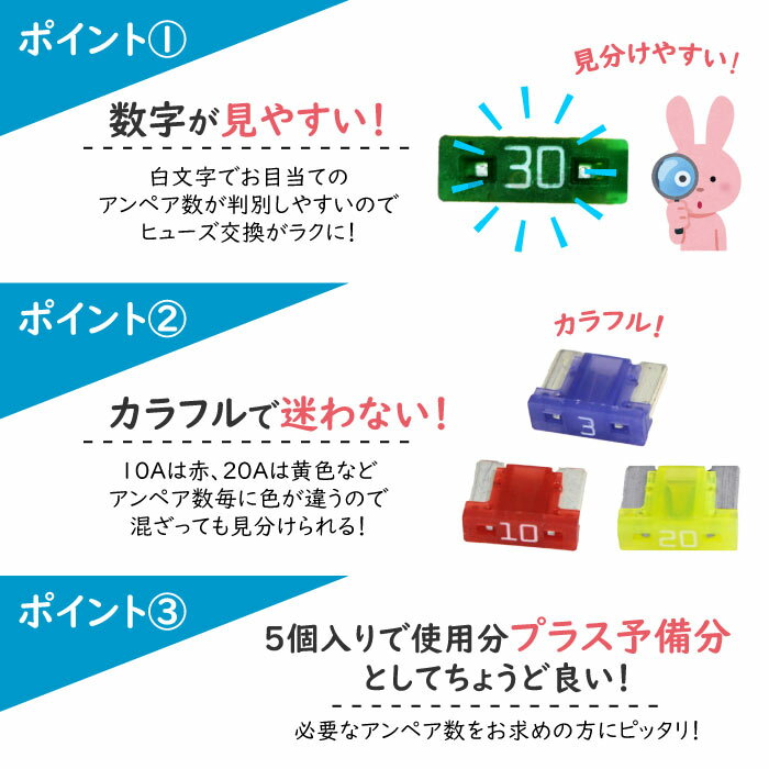 ヒューズ 低背 ブレード 選べる 1種 5個 セット 車 カー バイク 電装 ヒューズBOX 白文字 2A 3A 4A 5A 7.5A 10A 15A 20A 25A 30A 緊急 交換 安全 応急処置 メンテナンス