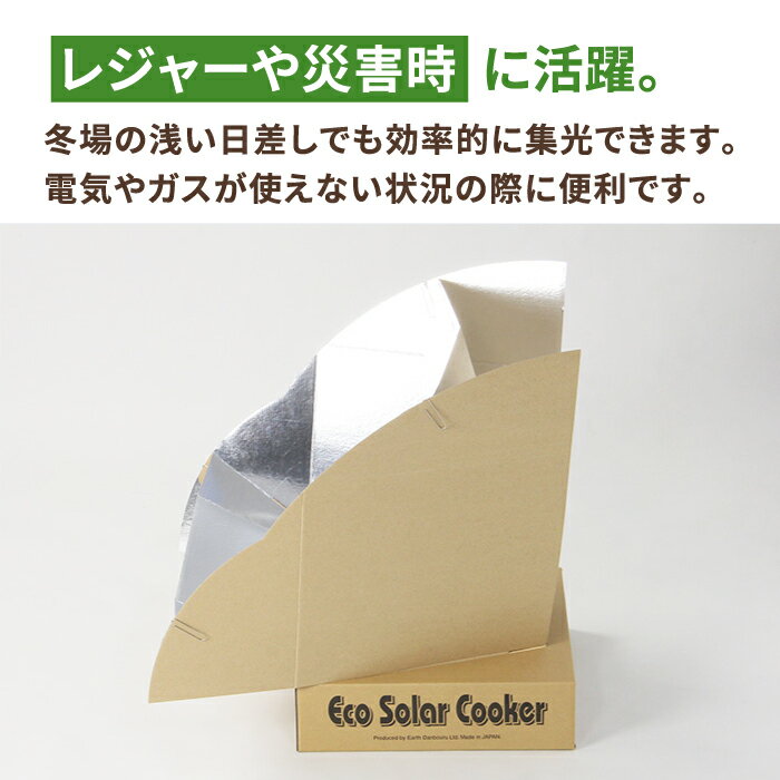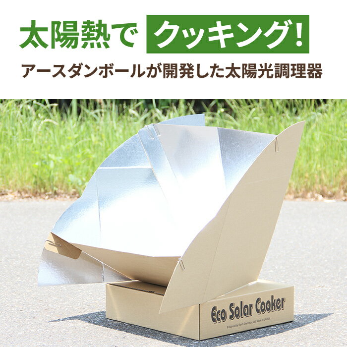 商品説明 ■太陽熱でエコクッキング アースダンボールが開発した、安価ながら実用性を備えた太陽熱調理器(ソーラークッカー)。 当社が独自に開発した新機構『SUNクリップ』を搭載。冬場の浅い日差しでも効率的に集光できるという、シンプルで効果の大きい仕組みを実現しました! 太陽熱エネルギーを使ってゆっくり楽しくエコクッキングができます。 ■お子様の学習教材に 自然ってすごいんだ!を実感。しかも、火を使わないので安心です。 お子様と一緒にいろいろなレシピを試して、実験してみてはいかがでしょうか。 ※注意事項※ ・加熱された器は非常に高温ですので、直接手で触れないようにご注意ください。 ・本製品は沸騰による殺菌や消毒を目的とするものではございません。 ・加熱できる温度は器の種類や、加熱物の量、天気などに異なります。 商品詳細 商品名 エコソーラークッカー 組立後サイズ(mm) 505×520×525 収納時サイズ(mm) 350×93×345 レシピ 湯沸し、ゆで卵、お米炊き、蒸しイモ・・・etc 付属品 本体、黒テープ、クリップ 1枚あたりの重量 638g 枚数 1枚 補足事項 ※沖縄県・離島ご地域へお届けの場合、追加送料が発生致します。 ※送料のかかる商品を同時にご注文された場合、追加商品に応じた送料が発生致します。 ※「レビューを書く」ボタンを押すと、購入履歴が開きます。購入履歴の中から書きたい商品の「商品レビューを書く」をクリックください。ダンボールでできた太陽熱調理器 アースダンボールが開発したソーラークッカー。レジャー、教材、非常時の備えに役立ちます。 <こんな用途に> ・レジャーや自由研究に ・災害用の備蓄に 太陽熱でエコクッキングダンボール製の太陽熱調理器(ソーラークッカー)。冬場の浅い日差しでも効率的に集光できる構造です。太陽熱エネルギーを使ってゆっくり楽しくエコクッキングできます。 湯沸かしから目玉焼きまで実際にアースダンボールでもさまざまな料理にトライしてみました。しっかり熱されるので、食品の温め、湯沸し、ゆで卵、お米炊き等々、レシピもどんどん広がります。 レジャー、学習教材、備蓄に小脇に抱えられるサイズなので、レジャーや災害用の備蓄にピッタリ。また、理科の実験用学習教材にもなります。親子でぜひ楽しんでください。 小ロットに対応アースダンボール製品は、必要な数量でお気軽に購入いただけます。 ダンボール専業メーカー昭和28年3月27日埼玉県に創業。以来、ダンボール箱の製造・販売に取り組んでおります。 国内工場で製造アースダンボール製品は、約9割が日本国内工場で製造されており、工場からお客様まで丁寧にお届けいたします。