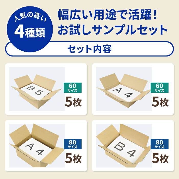 おためしダンボール箱 定番セットB 20枚 ダンボール 60サイズ ダンボール箱 おためし セット 宅配60サイズ 宅配80サイズ A4 B5 B4 80 60 段ボール 箱 梱包 梱包資材 梱包セット ダンボール梱包 宅配便 小型 衣類 発送 フリマアプリ メルカリ ラクマ (2079)