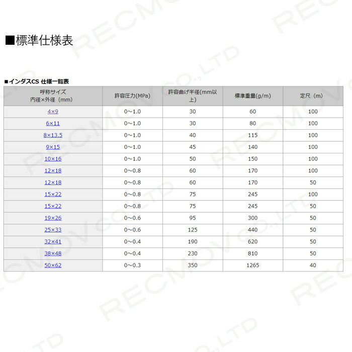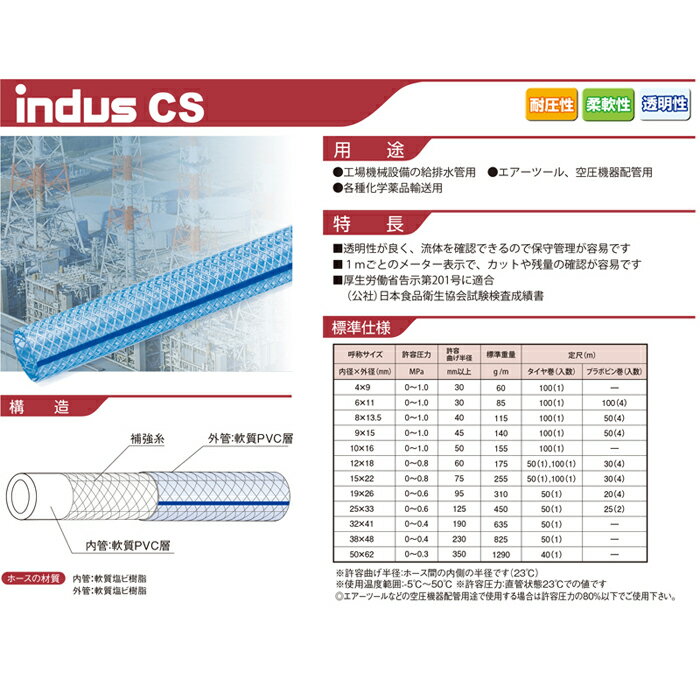 カクイチ エアホース ブレードホース インダスCS 内径9mm×外径15mm×100M巻 透明 ■工場機械設備の給排水管用に。エアーツール、空圧機器配管用に。各種化学薬品輸送用に。 耐薬品性に優れ、幅広い利用が可能です。 ■透明性が良く、流体を確認出来るので、保守管理が容易 ■1mごとにメーター表示があり、カットや残量の確認が容易 ※使用温度範囲:-5℃ 〜 50℃ ※エアーツールなどの空圧機器配管用途で使用する場合は、許容圧力の80%以下でご使用下さい。 ■インダスCS 仕様一覧表 呼称サイズ 内径×外径(mm) 許容圧力(MPa) 許容曲げ半径(mm以上) 標準重量(g/m) 定尺(m) 4×9 0〜1.0 30 60 100 6×11 0〜1.0 30 80 100 8×13.5 0〜1.0 40 115 100 9×15 0〜1.0 45 140 100 10×16 0〜1.0 50 150 100 12×18 0〜0.8 60 170 100 12×18 0〜0.8 60 170 50 15×22 0〜0.8 75 245 100 15×22 0〜0.8 75 245 50 19×26 0〜0.6 95 300 50 25×33 0〜0.6 125 440 50 32×41 0〜0.4 190 620 50 38×48 0〜0.4 230 810 50 50×62 0〜0.3 350 1265 40 エアホース エアーホース 圧送 ホース カクイチ 農業 工業 土木 建設 清掃 透明 半透明