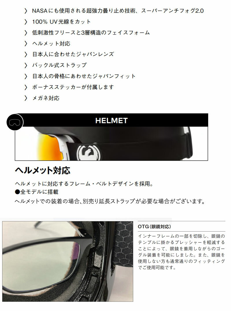 DRAGON【D1】 コメント 初心者から玄人まで愛用者が多いディーワン。 ラージサイズの平面スタンダードフレームで、伝統的なゴーグルデザインを継承しながら現代のテクノロジーを採用しました。 広い視野と安定感のある機能性、着用時のスタンダードなデザイン性が人気のモデルです。 DX3に対してやや縦長のシルエットで男女問わずフィットします。 眼鏡対応仕様。 ・NASA採用実績有りの超強力曇り止め技術、スーパーアンチフォグ2.0 ・100%UV光線カット ・低刺激性フリースと3層構造のフェイスフォーム ・ヘルメット対応 ・日本人に合わせたジャパンレンズ ・バックル式ストラップ ・日本人の骨格にあわせたジャパンフィット ・ボーナスステッカー付属 ・メガネ対応 当店DRAGONゴーグルは全てJAPAN FIT使用の日本正規品になり、日本人のフェイスシェイプに仕様、JAPAN LUMALENSの日本人の目にあったレンズの商品です(一部JAPAN LUMALENSではなく調光、グローバルルーマレンズ仕様の物もあります)。 並行輸入品などのJAPAN FIT、JAPAN LUMALENSを採用していない物ではございませんのでご安心してお買い求め下さい。 ※掲載写真の色合いは、PCモニター環境や撮影時の光環境により実物と若干違う可能性もございますのでご了承ください。 ゴーグルのサイズ感、見え方等、ご不明な点があればお気軽にお問い合わせください。 ※フェイスマクク等ゴーグル下部に挟んでつける場合、ゴーグル内部が曇り易くなります。 息の抜けをゴーグル内部に送り込まないようフィッティングすると解消されます。 ※ゴールが雪、雨、汗で濡れたり湿気をまとうシュチュエーションになった場合、ダブルレンズ内部の曇りを防ぐため乾燥させてからご使用ください。 ※こちらの商品はご予約商品の為、お届けは10月~11月頃からお届け開始予定です。通常商品とは納期、お支払方法等違いますので必ずご予約詳細ページをご覧頂きご理解いただいた上でのご注文お願いいたします。 また、一部メーカー予定在庫になりますので、欠品の場合が御座います事をご了承ください。 ▲ご予約方法、お支払方法はこちらをチェック!!▲ ▲ジャパンフィットに日本人の目に合わせたコントラストレンズ▲ 交換について ウエアのメンテナンス インソール&ソックス 防寒・日焼け対策に! メーカー希望小売価格はメーカーカタログに基づいて掲載しています。レビュー内容に関して:2025/05/29 25-26モデルに変更。24-25モデルよりデザイン変更。ブランド名DRAGON ブランド名カナドラゴン モデル名D1 モデル名カナディーワン 商品ゴーグル スノーボード スキー 年式2025-2026 対象メンズ レディース キーワードハイコントラストレンズ バックルベルト ダブルレンズ ジャパンフィット カラー展開ブラック/黒 ベージュ グレー カーキ