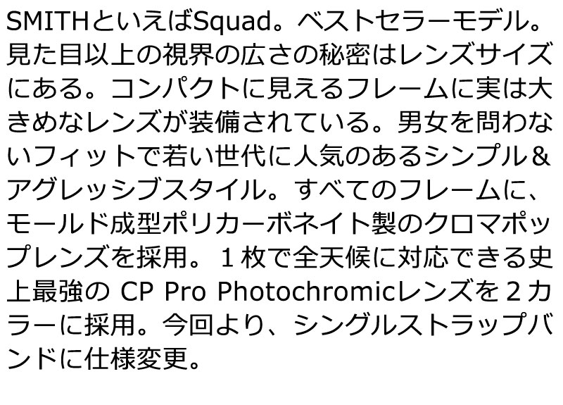 SMITH【SQUAD プロ調光】 コメント SMITHといえばSquad。ベストセラーモデル。見た目以上の視界の広さの秘密はレンズサイズにある。コンパクトに見えるフレームに実は大きめなレンズが装備されている。男女を問わないフィットで若い世代に人気のあるシンプル&アグレッシブスタイル。すべてのフレームに、モールド成型ポリカーボネイト製のクロマポップレンズを採用。1枚で全天候に対応できる史上最強の CP Pro Photochromicレンズを2カラーに採用。今回より、シングルストラップバンドに仕様変更。 ※掲載写真の色合いは、PCモニター環境や撮影時の光環境により実物と若干違う可能性もございますのでご了承ください。 ゴーグルのサイズ感、見え方等、ご不明な点があればお気軽にお問い合わせください。 ※フェイスマスク等ゴーグル下部に挟んでつける場合、ゴーグル内部が曇り易くなります。 息の抜けをゴーグル内部に送り込まないようフィッティングすると解消されます。 ※ゴールが雪、雨、汗で濡れたり湿気をまとうシュチュエーションになった場合、ダブルレンズ内部の曇りを防ぐため乾燥させてからご使用ください。 ※こちらの商品はご予約商品の為、お届けは9月~11月頃からお届け開始予定です。通常商品とは納期、お支払方法等違いますので必ずご予約詳細ページをご覧頂きご理解いただいた上でのご注文お願いいたします。 また、一部メーカー予定在庫になりますので、欠品の場合が御座います事をご了承ください。 ▲ご予約方法、お支払方法はこちらをチェック!!▲ ▲シャープに、クリアに、そして鮮明に▲ 交換について ウエアのメンテナンス インソール&ソックス 防寒・日焼け対策に! メーカー希望小売価格はメーカーカタログに基づいて掲載しています。レビュー内容に関して:2025/8/17 25-26モデルに変更。24-25モデルよりデザイン変更。シングルストラップバンドに仕様変更。ブランド名SMITH ブランド名カナスミス モデル名SQUAD プロ調光 モデル名カナスカッド 商品ゴーグル スノーボード スキー 年式2025-2026 対象メンズ レディース キーワード平面レンズ 調光レンズ アジアンフィット クロマポップ カラー展開ブラック/黒 グレー/灰色