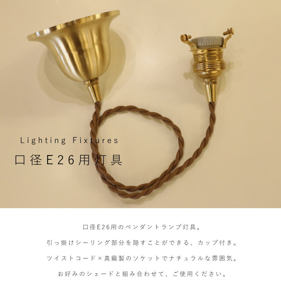 ■商品名 口径E26用灯具 シーリングカップ付き ■送料 送料サービス (沖縄県・離島は1,100円(税込) ■サイズ ■取付タイプ 横ネジタイプ ■コード長さ / 重量 30cm:約185g 60cm:約195g 100cm:約210g 150cm:約230g 口金 :E26 白熱電球60Wまで ■カラー 画像でご確認下さい。 ■材質 真鍮 ■商品説明 天井の引掛けシーリングを隠すことができる カップ付きの灯具。 お好みのガラスシェードと組み合わせて ご使用いただけます。 コード長さは4タイプ。 お部屋に合わせてサイズをご選択ください。