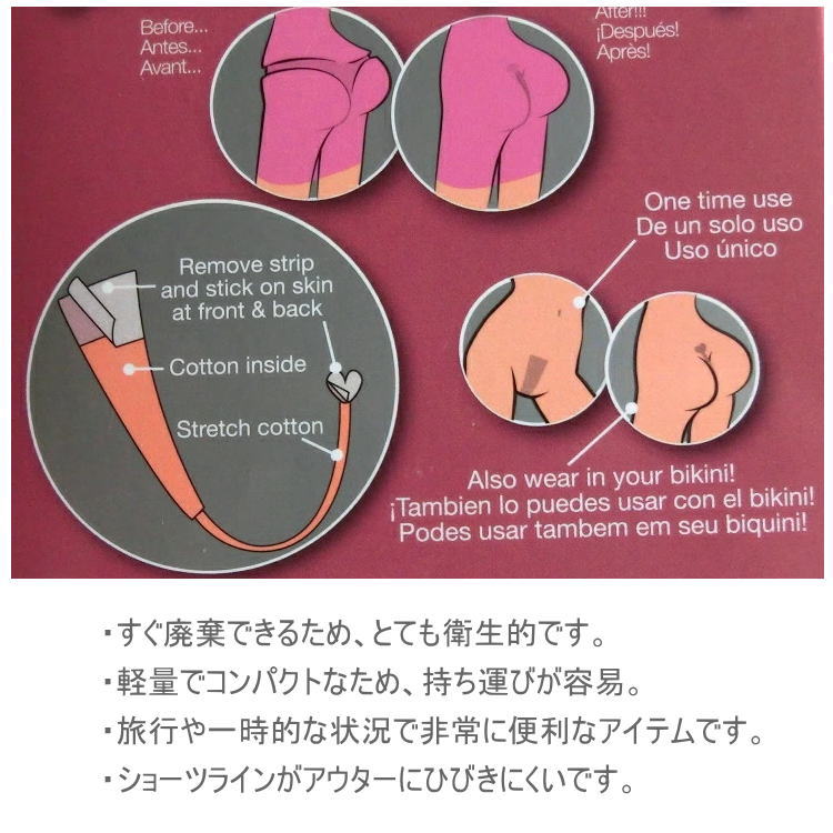 ■素材 レーヨン75% ポリエステル25% ■サイズ One Size(4枚入り) ■商品説明 パンティーラインがアウターにひびきにくいので、ラインを気にせずオシャレを楽しめます。 正面と後ろに皮膚に付けられるようになっています。 使い捨てタイプなので持ち運びにも便利!旅行などにもオススメです。4枚入り。 ※直接肌に着用する商品ですので、肌が弱い方はご使用をおやめください。 【輸出元】MAGIC BODYFASHION(オランダ) 原産国 中国 マジックボディファッション ■カラー ラテ ■関連ワード 貼るショーツ Tバック 使い捨て 4枚入り 衛生的 軽量 アウターにひびきにくい ワンサイズ フリーサイズ 旅行 キャンプ 宿泊 下着 パンツ インナー ランジェリー ティーバック関連商品Lejaby レジャビー Tバック タンガ ショーツ 5562NPn ...Lejaby レジャビー Tバック タンガ ショーツ 5401e M ...Maison Close メゾンクローズ Tバック Gスト Micro...2,640円2,640円2,970円ZERMATT ツェルマット Tバック タンガ ショーツ レディース ...Chasney Beauty チェスニービューティー Tバック タンガ...Kiya キヤ タンガ Tバック レース 3974 M 下着 レディー...2,926円2,860円3,520円hanky panky ハンキーパンキー タンガ Tバック レディース...Tバック シームレス M L シームレスショーツ スキンカット プチプ...Chasney Beauty チェスニービューティー Tバック タンガ...4,400円880円4,004円【限定カラー】 COSABELLA コサベラ タンガ Tバック NEV...ZERMATT ツェルマット タンガ Tバック 2420 M ローライ...RINZ リンズ Tバック タンガ M コードレース 豪華 総レース ...5,500円3,344円3,300円商品説明 ブランド MAGIC BODYFASHION サイズ One Size(4枚入り) カラー ヌード 素材 レーヨン75%、ポリエステル25% 生産国 オランダ企画 中国製 特徴 使い捨てタイプの貼るTバックです。 ショーツラインがアウターにひびきにくく、オシャレを楽しめます。 使用後すぐに廃棄できるため、非常に衛生的です。 軽量でコンパクトなため、持ち運びが容易です。 旅行や出張、キャンプなどの際に便利です。 特に旅行や一時的な状況で非常に便利なアイテムです。正面と後ろに皮膚に付けられるようになっています。 ※直接肌に着用する商品なので、肌が弱い方はご使用をおやめください。 関連商品 … 備考 メール便発送可能です。 注意点 ……在庫に関して…… こちらの商品は店頭商品となります。 在庫数の更新は随時行っておりますが、実店舗でも販売中なので、 ご注文のタイミングによっては完売となる場合がございます。 その場合にはお客様に必ずご連絡を致しますが、万が一入荷予定がない場合は、 ご注文をキャンセルさせていただく場合もございますことを予めご了承ください。 ……商品画像に関して…… 掲載中の商品画像は、実際の商品のカラーに近づけるよう努力しておりますが、お客様にご覧いただいておりますモニターやグラフィック機能などのPC環境の違いや、撮影時の光源の違いなどにより画面上と実際の商品とでは色が異なる場合がございます。