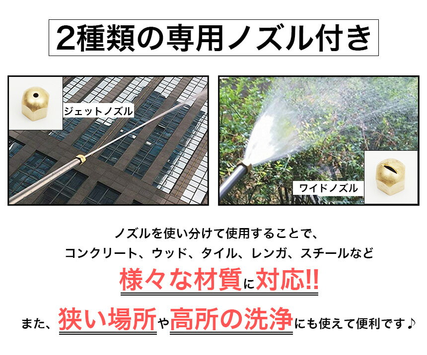 ■商品説明 電源不要で簡単使用 電気代0円!!ホースにつなげるだけで簡単に高圧洗浄!! 通常の水洗いでは落ちにくい汚れも、簡単に洗い流すことができます。 2種類の専用ノズル付き ノズルを使い分けて使用することで、 コンクリート、ウッド、タイル、レンガ、スチールなど あらゆる材質に対応!! 庭や畑への水やり、エクステリアやガーデニング、洗車、タイヤ周りの清掃、 窓、網戸、シャッター、アプローチ、タイル、壁面、階段の汚れ落としなど、 家庭のあらゆる場所で活躍します! 狭い場所や高所の洗浄にも使えて便利!! 軽量なので年配の方や女性でも軽々と作業ができます。 また、コンパクトサイズで収納スペースにも困りません。 ■商品仕様 カラー:ホワイト 付属品:本体、ジェットノズル、ワイドノズル、ジョイント サイズ:50cm×5cm×3cm 重 量:290g 材 質:アルミ合金、スチール、ABS樹脂、合成ゴム等 ■ご注意事項 ※ホース内径は、12〜15mmのものをご使用ください。 内径12mm以下(コンパクトホース)では、 水圧が低下し十分な効果が得られない可能性がございます。 ※水圧が低い環境では、ジェット水流が得られないことがございます。 ※ホース側にコネクターが無い場合は、別途お求めの上ご使用ください。 ※ご使用時は必ず人や生き物に向けないで下さい。 ※先端を覗き込むような事は決してしないでください。 ※海外製造品のため、軽微な傷や汚れがある場合がございます。 ※商品デザインやパッケージ、仕様等は予告なく変更される場合がございます。 ※ご閲覧の環境により、実際の商品と色味等異なって見える場合がございます。 ※日本語説明書やパッケージ、撮影用小物類は付属しておりません。 ※当商品の使用中に生じた如何なる損害や被害も、弊社では一切の責任を負いかねます。