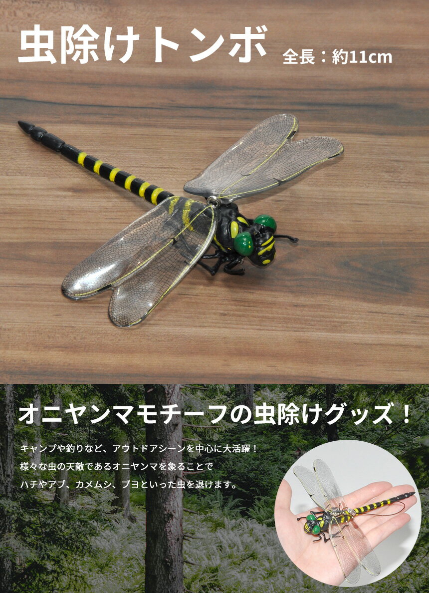 ■商品説明 身に付けるだけで虫除けに! キャンプや釣りといったアウトドアシーンにぴったりの オニヤンマモチーフ虫除けグッズです。 本物そっくりの精巧な作り。 様々な虫の天敵であるオニヤンマは、ハチやアブ、ブヨ、カメムシなどといった虫を退けます。 ストラップ・安全ピン付きで、 すぐに衣服やバッグ、帽子などに取り付けて使用することができます。 ■商品仕様 サイズ:約11×11.5×2cm 重量:約14g 生産国:中国 ■ご注意事項 ※日本語説明書は付属しておりません。 ※簡易包装でのお届けとなります。 ※海外製造品のため、軽微な傷や汚れがある場合がございます。 ※ご閲覧の環境により、実際の商品と色味等異なって見える場合がございます。 ※商品の使用により生じた如何なる損害・被害も、弊社では一切の責任を負いかねますので予めご了承下さい。