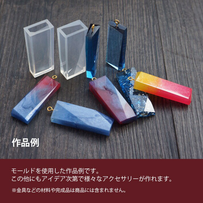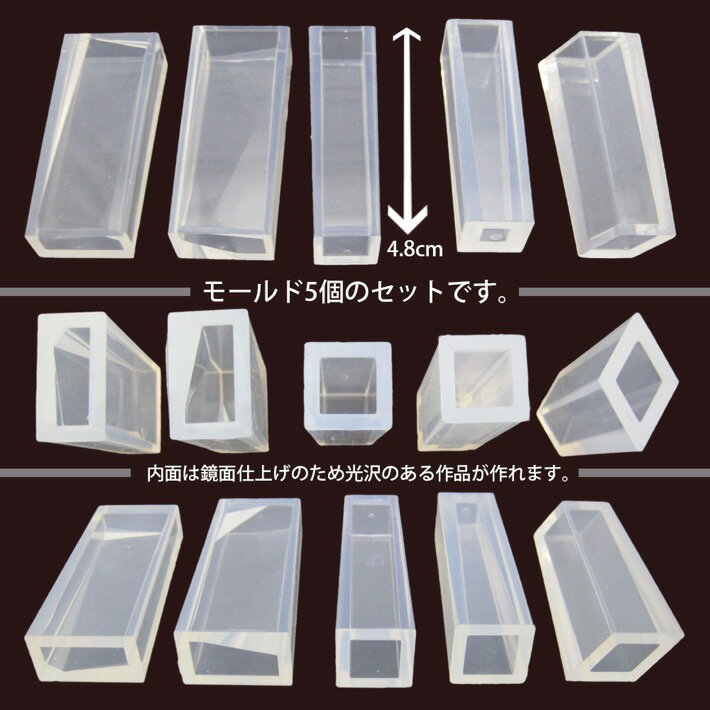 INFORMATION UVレジン、エポキシ樹脂、樹脂粘土などに ご利用いただけるシリコン型 四角やひし形など5種類のモールドをお楽しみいただけるシリコン型です。 商品内容:5点セット 各仕上がりサイズ:画像をご確認ください。 商品はシリコン型のみになります。 作品例のサンプル、金具等は付属しておりません。