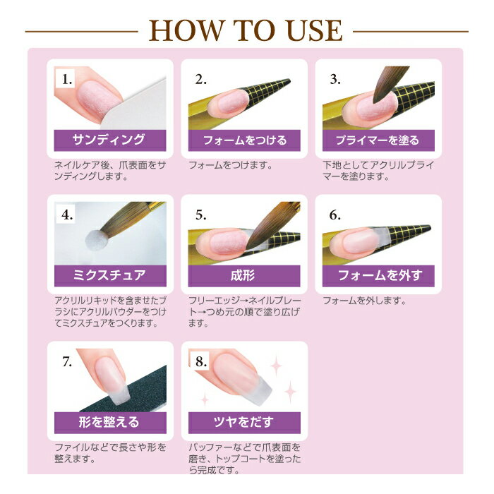 憧れのスカルプチュアを自宅で!すぐに始められる豪華9点セット ・アクリルパウダー ・アクリルリキッド ・アクリルプライマー ・アクリルリムーバー ・ネイルチップ ・ファイル ・ネイルグルー ・ブラシ ・フォーム 【使用方法】 1.ネイルケア後、自爪をサンディングします。 2.フォームをつける。 3.下地としてアクリルプライマーを塗ります。 4.アクリルリキッドを含ませたブラシに、アクリルパウダーをつけてミクスチュアをつくります。。 5.フリーエッジ→ネイルプレート→つめ元の順で塗り広げて、成形します。 6.フォームを外します。 7.ファイルなどで長さや形を整えます。 8.バッファーなどで爪表面を磨き、トップコートを塗ったら完成です。 商品名 スーパーファーストスカルプチュアキット ASF1800 使用上のご注意 ・使用中は必ず換気してください。 ・火気のある所では使用しないでください。 ・子供の手の届かないところに保管し、絶対に触らせないでください。 ・絶対に他の商品とは混ぜないでください。 ・破棄する際は、各自治体の破棄要領に従ってゴミとして破棄してください。 メーカー 株式会社ビューティーワールド 区分/製造国 化粧品/中国(デザイン日本) 広告文責 株式会社アスティ 092-541-7511