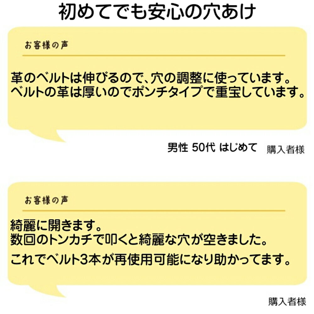 ベルトやカバンの穴あけに。初心者OKの便利ポンチセット ベルトの穴あけ、カバンのショルダーストラップ補修、レザークラフトなどに最適な、定番の「穴あけポンチ」セットです。打ち具の前処理にも対応。初心者の方にも安心の説明書付き。 選ばれる理由(レビュー抜粋) 「カバンの肩掛け穴を増やしたくて購入。綺麗に開けられました」 「本革のショルダーにも10回ほど叩けばスパッと開く」 「修理屋さんに出すより手軽でコスパ最高」 こんな用途におすすめ ベルトの穴あけ・長さ調整 ショルダーバッグやカバンの補修 レザークラフト、フェルト細工、布タグづくり ハトメ・カシメ・ボタン取付け前の穴あけ処理 対応素材・対象 本革、合皮、布、厚紙、フェルトなどに対応。DIYや手芸、リメイク・修理用途にも最適です。 商品仕様 サイズ:6サイズ(2.0/2.5/3.0/3.5/4.0/5.0mm) 付属品:六角レンチ、説明書 材質:炭素工具鋼(本体)・ハイカーボン鋼(刃) ※スマートフォン・PCで色の見え方に違いがある場合があります。 よく使われているシーン 鞄用の生地やレザーの穴あけ ベルト穴 段ボール 厚紙の穴 ショルダーバッグの肩紐の穴 スマホケースのストラップホール 時計のベルト バンドの穴 手帳のリフィルの穴 ブレスレットの穴 サンダルのベルトの穴 台紙の穴 アクセサリーの穴 革タグの穴