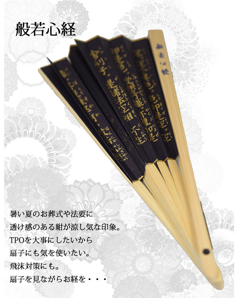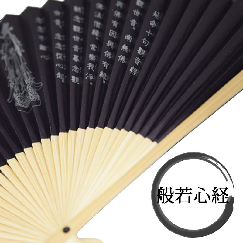 暑さ対策&飛沫対策 TPO ブラックフォーマル 般若心経 扇子 暑い夏に、必需品の扇子 冠婚葬祭、法事などにはフォーマル扇子。 両面使いOKなので高級感があります。 表面には全面に般若心経が金色が、 裏面の真ん中には菩薩様のお姿が 「十句観音経」と「四弘誓願」が両側に書かれています。 フォーマルシーン以外の普段にも、般若心経扇子。 \ 名入れ&父の日限定メッセージ刻印 / 扇子の親骨(外側の竹の部分)に、 お名前や会社名などの刻印が可能です。(+550円) \ 今だけ!父の日特典 / 「Thank you」「ありがとう」 どちらかをお選びいただき、無料で刻印いたします。 海外へのお土産・贈答用・記念品・父の日など、 特別なギフトとしてもおすすめです。 ※フォントは画像に使用の1種のみとなります。 ※手作業のため位置や濃さに若干の個体差がございます。 ※画数の多い文字は線が潰れる場合があります。 例:「龍」などは不鮮明になる可能性がございます。 おすすめ:智奈美・AKIRA など画数の少ない表記 海外へのご出張や、お土産、 プレゼント等にも大変喜ばれるアイテム扇子 素材:扇面:紙 男女兼用 約22.5cm 【メール便発送可】 ギフト対応 【関連ワード】 扇子 名入れ プレゼント ギフト 法事 父の日 海外土産 日本製 彫刻 会社名 刻印対応 おしゃれ 般若心経 十句観音経 フォーマル ブラック 男女兼用 和柄 記念品 贈り物 仏教 美しい 扇面 親骨 風流 上品 高級 竹製 名入れ対応 名前入り【扇子 センス 冠婚葬祭 般若心経 紺 金 暑さ対策 ギフト】 ブラックフォーマル 扇子。 暑い夏に、必需品の扇子 冠婚葬祭、法事などにはフォーマル扇子。 両面使いOKなので高級感があります。 海外へのご出張や、お土産、 プレゼント等にも大変喜ばれるアイテム扇子 お名前・会社名の刻印OK! 世界にひとつの特別な扇子を。 母の日、父の日・敬老の日・海外への和ギフトや、 会社ロゴやイベント記念品としてもおすすめです。 ※フォントは画像の1種類のみとなります。 ※刻印位置・濃さは1点ずつ手作業のため、個体差がございます。 仕上がりは職人におまかせください。 名入れをご希望の場合は、 ご注文時に【名入れ内容】をご入力ください。 ※画数の多い漢字や4文字以上の名入れは、 彫刻がやや不鮮明になる場合がございます。 読みやすく美しく仕上がるよう、職人がバランス調整いたします。 <仕上がりが美しい文字例> 智奈美・涼介・AKIRA・NAGASAWA など (2〜3文字/画数控えめな漢字 or ローマ字がおすすめです) 普段のご自分使いとしてはもちろん ギフトにも選ばれています 素材 扇面:紙 サイズ男女兼用 約22.5cm ※お写真は実際の商品をできるだけ忠実に再現するよう努力しておりますが、 ディスプレイ画面等の環境などから、ページで見た色と実際の商品の色とは多少違う場合がございます。ご不明な点はおお気軽に問い合わせ下さい。 -扇子あります-