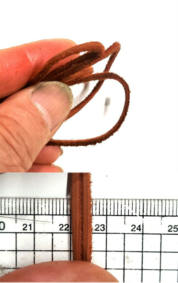材質:鹿革(ディア)使用 サイズ:長さ約150cm(以上)、幅約3mmと厚み約1.5mmの鹿革を裁断した紐を粉が出にくいように水洗いしてタオルで拭き仕上げしました。画像で確認できる通り16ゲージ(1.29mm)の穴に通ります。 鹿革はとても丈夫なのでアクセサリー制作にはもってこい♪クラフト材料にいかがですか?色々なことに使えそうです* ※すべての発送方法がご利用いただけます(代引き・お届け日時指定は宅配便のみ対応です)メール便ご希望の場合は、ご自身で変更しなければ自動ではなりませんのでご注意下さい。
