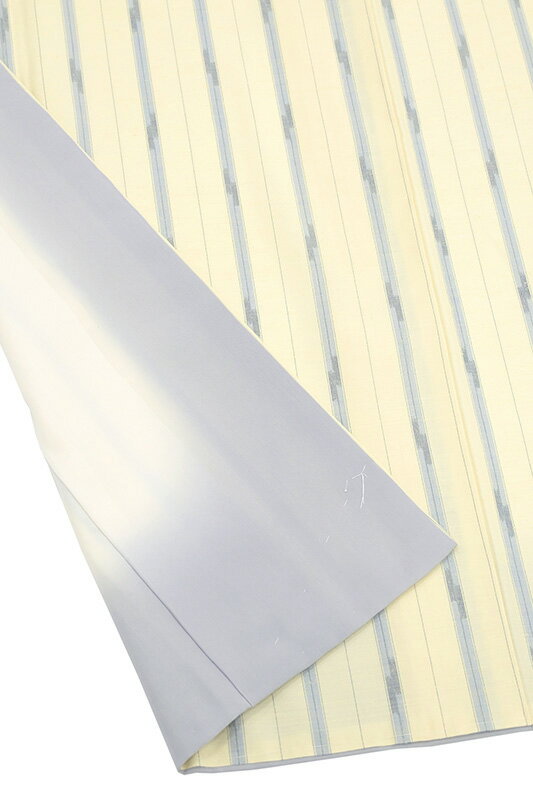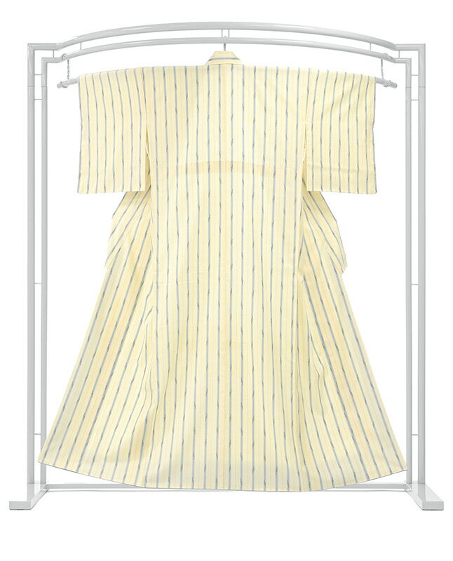 【ショップ評価★5ありがとう♪】着物だいやす 693■紬■本場久米島紬 手織 縞に経絣 淡黄色 ソテツ 草木染 特選 身長サイズ:L【正絹】【仕立て上がり着物】【仕立て替え】【送料無料】【中古】