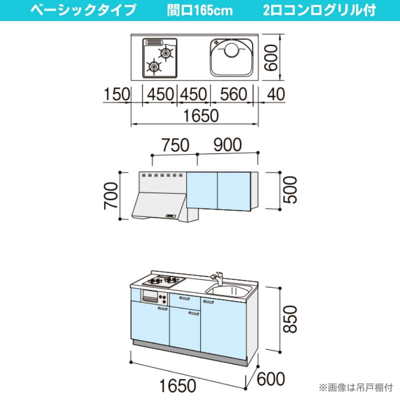 コンパクトキッチン ティオ Tio LixiL 壁付I型 ベーシック W1650mm 間口165cm(グリル付き2口コンロ用) グループ1 リクシル システムキッチン 流し台