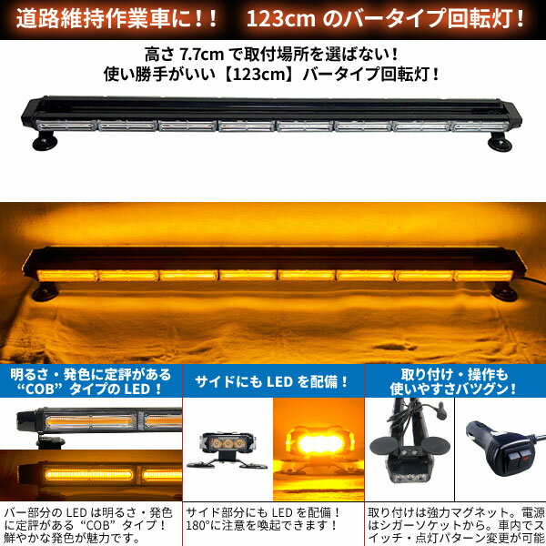 回転灯 黄色灯 12V 24V 123cm 道路維持管理車両用 LED バータイプ アンバー イエロー COBチップ採用 バーサイドLED シガーソケット マグネット 道路維持作業用自動車 道路パトロール車 警告灯 パトランプ パトロールライト パトロールランプ ストロボ ビーコン WB8236-8S