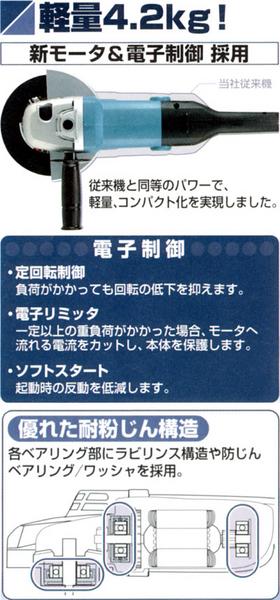 軽量&ハイパワー 新モータ&電子制御の採用でパワフル切断、切削を実現。 仕様 外径 180mm 厚さ 6mm 内径 22mm 回転数[回転/分] 6000(min-1) 電源 単相100V 単相200V 電流 100V 15A 200V 9.5A 消費電力 100V 1430W 200V 1800W 機体寸法 長さ453x幅200x高さ137 質量 4.2kg コード 2.5m 標準付属品 研削砥石 36P ロックナットレンチ35 グリップ