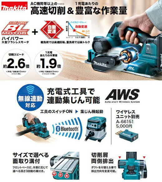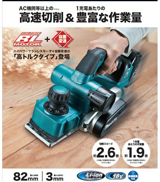 マキタ KP181DZ (本体のみ)(バッテリ・充電器別売) 82mm 充電式カンナ 18V ハイパワーブラシレスモータ+自動変速の「高トルクタイプ」 最大切削幅82mm/最大切削深さ3mm 無線連動対応(別売のワイヤレスユニットA-66151)が必要です。 サイズで選べる面取り溝付 切削屑両側排出