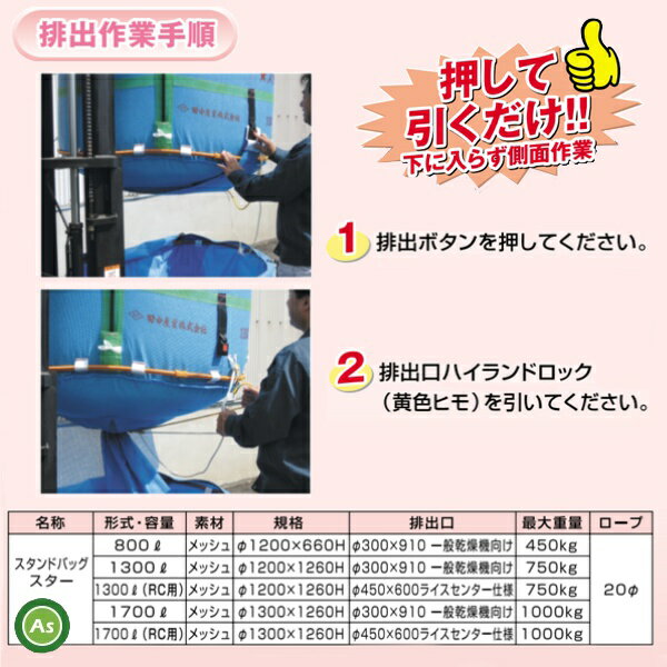 商品仕様 型式:スタンドバッグスター 容量:1,300L 規格:Φ1,200×1,260H 排出口:Φ300×910 (一般乾燥機向け) 最大重量:750kg 吊りロープ:Φ20 生地:メッシュ 商品説明 グレンタンク付コンバインでの刈取りかた乾燥機投入までの籾・麦大量運送袋。 排出作業も本体の下に入らず、本体の横で操作(作業)するので安全・安心。 投入口がファスナー式で全開の為、投入作業が楽!! 収納方法も簡単で、くるっとひねってたためます。 新JIS対応にもクリア。 ホルダーレス(自立型)のため、重たい鉄製ホルダーも必要なく、スペースも取らず経済的。 オール網状で蒸れにくく、RC・CEなどでの順番待ちによる一時貯留も安心!! KSAS乾燥システム対応「無線タグ」の取り付けも可能です。 注意事項 ※ご使用の際は必ず、取扱説明書をお読みください。 ※ご注文後のキャンセル、返品交換はお受けできません。 ※配送料金の詳細はこちらからご確認ください。 配送地域について 北海道・沖縄・離島・中継地域への配送の場合は送料別途(都度見積もり)必要となります。