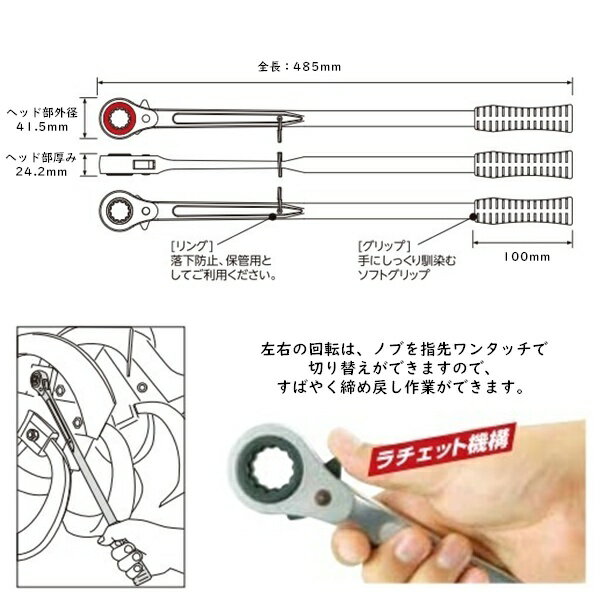 農業機械トラクター用の爪交換レンチです。 《安全性》 ギア数32山。強化型ラチェット全長が485ミリと長いため爪交換時に、腕や手をけがすることがありません。 《機能性》 2山ラチェット爪。17・19mm共用タイプであらゆる機種に使用できます。 (クボタ・ヤンマー・イセキ・三菱・日ノ本など) サイズ:17mm(赤色)19mmダブルサイズ 全長:485mm ヘッド部外径:41.5mm ヘッド部厚み:21.5mm 重量:840g JANコード:900027 配送料金の詳細はこちらです。