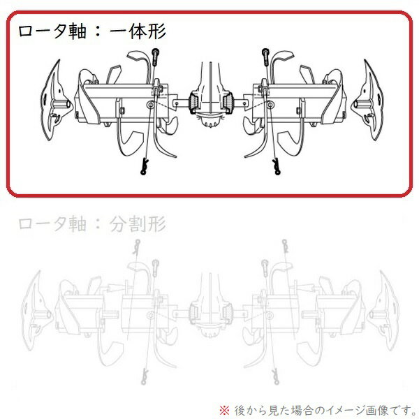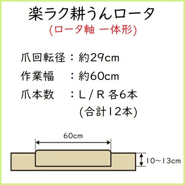 楽ラク耕うんロータ(A600) 98612-18360 適合型式 TMA300(ロータ軸一体形) , TMA350 仕様 爪回転径:約29cm 作業幅 :約60cm 爪本数 :L/R 各6本 (合計12本) ロータ軸 一体型 商品説明 畑・水田の耕起作業に。 ロータ両端についている左右のひねりが違うマジカルプレートを左右差し替えることで、 固い圃場ではロータが土中に食い込むように、軟弱な圃場ではロータが沈下しないようにすることができます!! 注意事項 ※ 画像はイメージです。 ※ 管理機本体は付属しておりません。 ※ お使いの型式を必ずご確認ください。 ※ お客様都合によるご注文後のキャンセル、返品・交換はお受けできません。 関連商品 ⇒ クボタ 管理機 耕うん爪 TMS30 スターローター T29 12本 7-101 東亜重工製 ⇒ クボタ管理機 アタッチメント TMA350・300用 楽ラク耕うんロータDX(A600) 宮丸アタッチメント 91154-03300