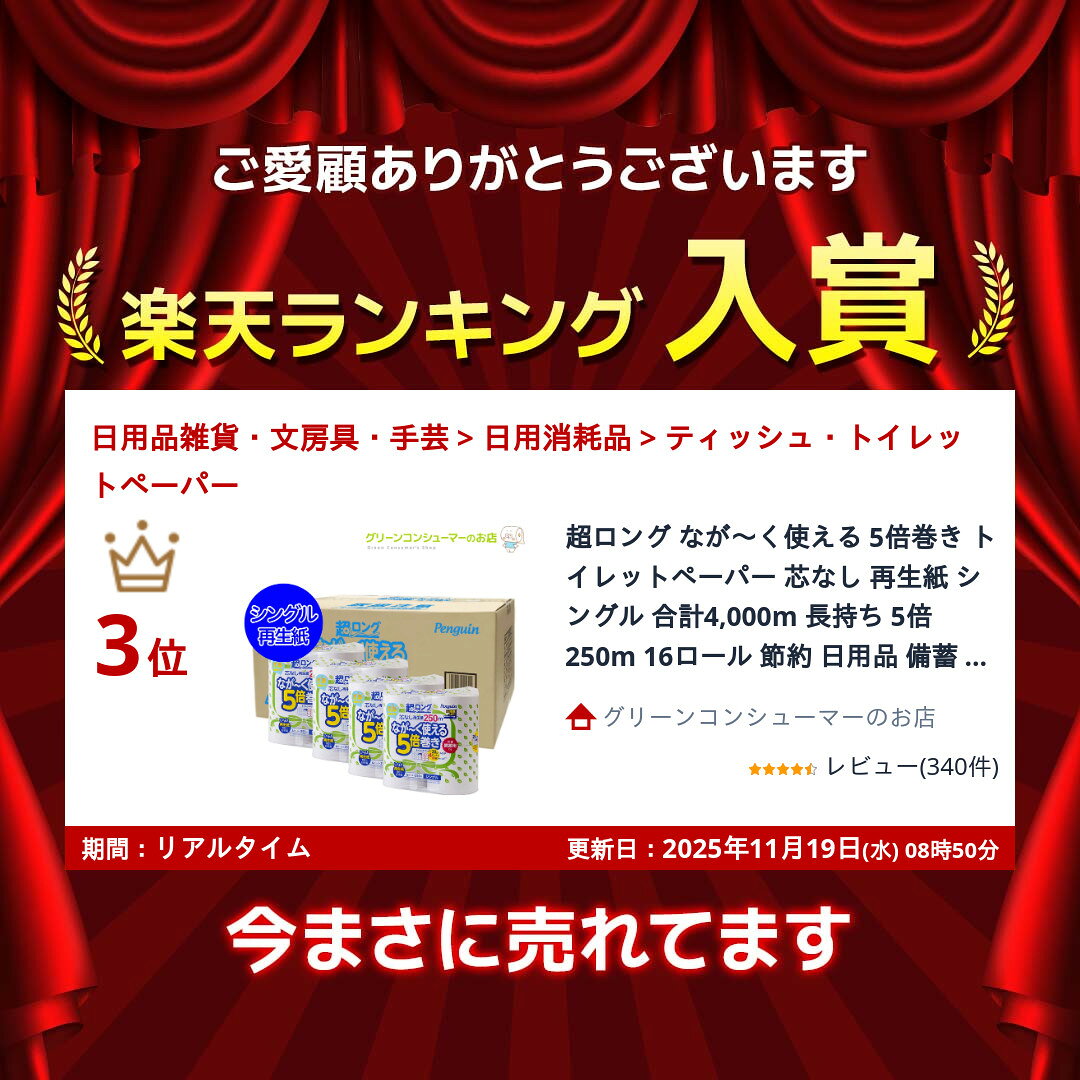 【お試しにも!お歳暮・ギフトにも!お求めやすい♪】 〜5倍巻きロールのハーフサイズが新登場!〜 ・通常セット品のハーフサイズ(16ロール入) ・取り換え頻度を大幅に減らせます! ・保管スペースが従来の5分の1に!(※) ・もしものときの災害、備蓄品として最適! ・芯ゴミを捨てる手間がありません! ・再生紙100%だから丈夫でしっかり♪ ・天然緑茶成分配合の消臭機能つき 4人家族1ヶ月あたりのトイレットペーパーの消費量は、約16ロールといわれています(日本家庭紙工業会調べ)。『超ロング5倍巻き』なら、たったの4ロールで一般的なトイレットペーパー(※)の長さ20ロール分に相当します。もしもの時の備蓄品としてご家庭や職場にあれば安心です! ※一般的な芯のあるトイレットペーパー(50mシングル)との比較トイレットペーパー 長持ち 芯なし上質古紙100%を利用した、 地球に優しいエコ商品です。 規格 シングル 長さ 250m ロール数 4 パック数 4 ケース寸法 幅490×奥行き490×高さ230mm(16ロール入) トイレットペーパー 長持ち 芯なし シングル