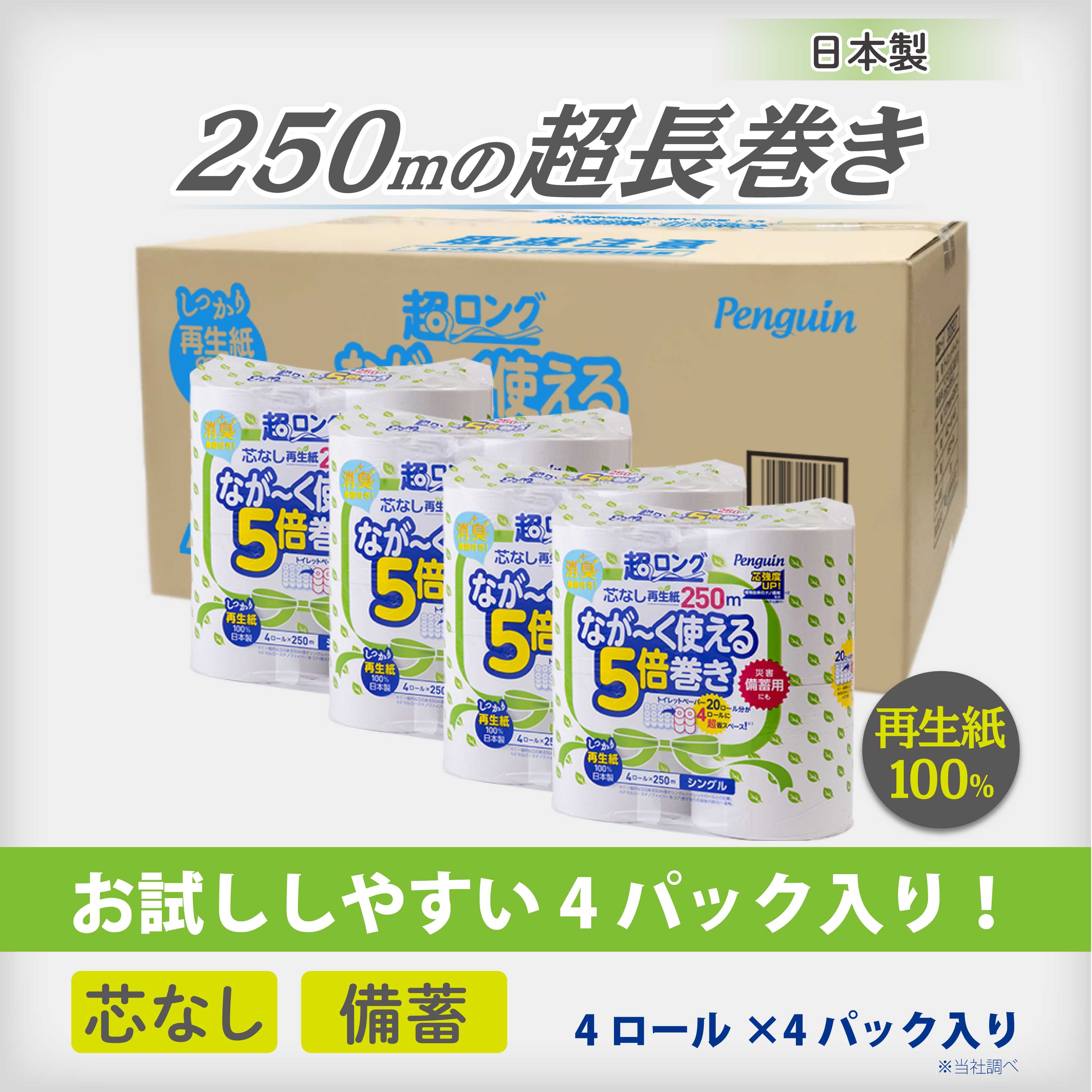 超ロング なが〜く使える 5倍巻き トイレットペーパー 芯なし シングル 再生紙 合計4,000m 長持ち 5倍 250m 16ロール 節約 日用品 備蓄 ギフト 長巻き エコ お試しサイズ ペンギン 丸富製紙 公式