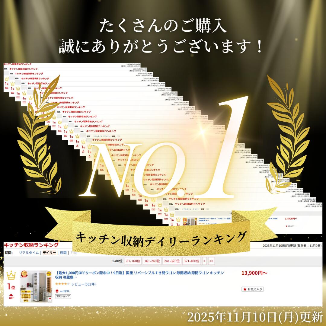 【国産】 リバーシブルすき間ワゴン 隙間収納 隙間ワゴン キッチン 収納 冷蔵庫横 ラック キャスター 洗面所 SNS パントリー ストッカー 幅10cm 12cm 14cm 16cm 18cm 20cm 22cm 24cm 奥行44cm 55cm 高さ181cm eco家具 F-250~