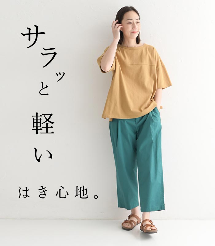 パンツ サラ・カル コットンストレッチ S〜4L タック入り 9分丈 大人 ナチュラル クロップドパンツ スリムパンツ レギンスパンツ パンツ ストレッチパンツ ゆったり 体型カバー サラカル 大きいサイズ ボトムス ズボン S M L LL 3L 4L earth_eco_loco オリジナル 綿 レディース 春 夏 40代 50代 60代 無地 ベージュ グレー カーキ 紺色 ネイビー 黒 ブラック 白 ホワイト オリーブグリーン チャコールグレー アーモンドブラウン イージーケア 洗濯機OK【 こちらは、ecolocoのオリジナル商品です 】 earth_eco_loco 「快適!サラ・カルパンツ」 リラックスタックパンツ すっきりバランスよくはける、タックパンツ 春夏、毎日心地よく過ごせるコットンパンツ。 短めの丈で軽やかなコーデにぴったり。 ウエストタックでお腹〜太もも周りにゆとりを持たせた、おすすめのリラックスパンツです。 タックを左右にひとつずつ。程よいボリューム感で、ふんわりとお腹周りをカバーしてくれます。 ヒップや太もも部分はゆったり、裾に向かっては余裕はあるけれど太すぎない、ストレートなシルエット。 さりげなく、オリジナルのピスネームが。 コーディネート ▼モデルデータ カラーバリエーション ※こちらのカラーが実物に一番近いものとなります。 素材 綿 98%/ポリウレタン 2% さらりとストレッチなコットン しっかりと目が詰まった平織りのやや薄手の生地。軽いハリはありますが硬さはなく、さらりとした質感です。 [透け感]目が詰まった生地のため、透け感はほぼありません。 [伸縮性]縦横に軽く伸縮性があります。 ▼洗濯表示について 全サイズ着比べました サイズ表 サイズ S M L ①総丈 85 86 87 ②ウエスト 60-80 64-84 68-88 ③ヒップ 108 112 116 ④裾幅 20 21 22 ⑤股上 31 32 33 ⑥股下 56 56 56 ⑦ワタリ 34 35 36 サイズ LL 3L 4L ①総丈 89 90 91 ②ウエスト 74-94 80-100 86-106 ③ヒップ 122 128 134 ④裾幅 23 24 25 ⑤股上 34 35 36 ⑥股下 57 57 57 ⑦ワタリ 37 38 39 ※商品により多少の個体差がございますのでご了承ください。 ※ウエストは「自然に置いた状態(最小)〜伸ばした状態(最大)」の寸法です。 ▼当店の採寸方法 サイズ選びのアドバイス 全体的にゆとりを持たせたサイズ感で、ウエストも後ろゴムなので普段のサイズでちょうどよく着ていただけるかと思います。 サイズ選びはウエストを基準にされる他、丈が短い形なので、身長高めの方は総丈や股下もチェックして。スタッフ着用画像も合わせてご検討ください。 まとめ 商品情報 ブランド earth_eco_loco コットンシリーズ 素材 綿 98%/ポリウレタン 2% 生産国 china カラー 05:ベージュ | 少し赤みのあるベージュ 17:ライトグレー | 少し黄色みのある、優しいライトグレー 36:カーキ | 薄めのオリーブのような緑寄りのカーキ 57:ネイビー | ほんの少し褪せたトーンのネイビー 21:ブラック | ほんの少し褪せたトーンのブラック 35:オリーブ | カーキより黄みと赤みがあり、ややくすんだ色目 19:チャコール | やや浅めのトーンの、黄みと赤みを感じるグレー 88:エメラルドグリーン | 青みが強い、鮮やかだが落ち着きのあるグリーン 43:マスタードイエロー | ほんの少し赤みがあるマスタードイエロー ecolocoのオリジナルearth_eco_loco「長い間着られる」「着心地がいい」「着回しができる」がキーワード。天然素材を中心に、6つのシリーズで展開しています。▶ コンセプトを見る ecolocoオリジナル対象。まずはルールを確認>>