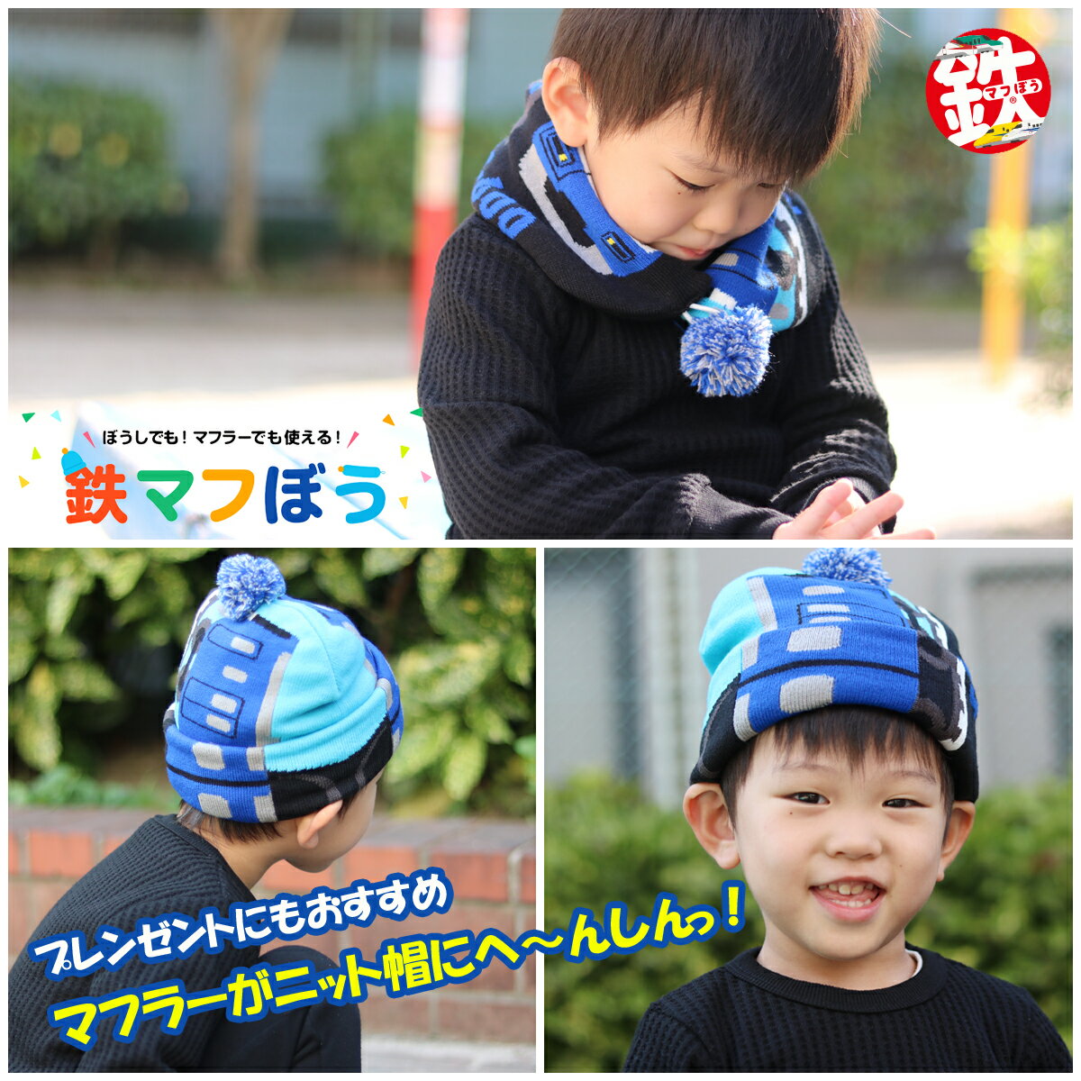 \本日▽全品5%OFFクーポン/ 鉄マフぼう ニット帽 マフラー キッズ 2WAY 子供 ベビー 鉄道 電車 新幹線 襟巻き 帽子 男の子 女の子 ボンボン付き キッズファッション キッズ小物 キッズコーデ 秋冬 子供 誕生日プレゼント 孫 プレゼント 甥っ子 クリスマス