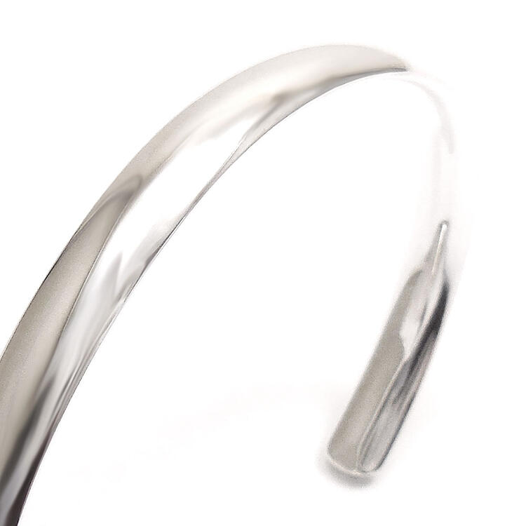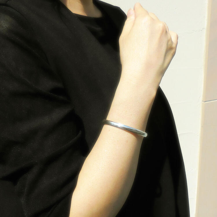 シルバーの良さが詰まった、ずっと使える定番バングル 飽きずにずっと使える、シンプルデザインのシルバーバングルです。 幅約5.5mm、緩やかな甲丸シェイプによってシルバーの反射率の高い輝きが優しくなり、ソフトな印象に。中空ではないので、身に付けるとちゃんと銀の重さを感じます。 見た目の印象、装着感、どちらも銀の特徴を楽しめるシルバー製バングルの王道。 素材は、メッキなどが施されていないシルバー925。使い込むうちに色味や表面の質感が変化。 光沢が弱まる代わりに深みと柔らかさが生まれ、味わい深い雰囲気を持ちます。そういった時間の流れを愛着を持って楽しめるのがシルバー地金製品の良さでもあります。 ご希望の方には、バングルの端にお名前などを刻印いたします。(別料金) 端なのであまり目立たちにくく、控えめながらもやはりお名前が入っていると嬉しいもの。ぜひご利用ください。 名入れ刻印インフォメーション バングルの端:表側にお名前などが刻印できます。目安として8~10字程度まで可能です。お名前・イニシャル・日付・短いメッセージなど。 ※刻印料:1,100円(税込)は受注後に加算致します。当店からのメールをご確認下さい。 文字タイプの刻印イメージ ■花文字 筆記体風の書体です。流れるような字体でデザイン性もあり、ちょっとオシャレな人気の文字タイプです。シーンを選ばず、さまざまなギフトに向いています。 ■オールドイングリッシュ クラシックな雰囲気のある書体です。他の書体に比べるとやや見づらいところは否めませんが、デザイン性は他の書体にはない独特のものがあります。「個性を出したい!」といった場合にオススメです。 ■ローマンライン 「花文字」や「オールドイングリッシュ」と比べると、シンプルでとても見やすいデザインのアルファベットです。見やすさ優先でしたらこちら。 商品詳細 サイズ 幅:約5.5mm、内寸:約5.5cm×4.5cm、開口部:約3cm、内回り:約16cm(開口部含む) 重量 約17g 素材 シルバー925 お手入れ方法 ・日々のお手入れは、柔らかい布で拭いてください。 ・銀特有の変色には、製品に付属する研磨剤入りの磨き布を使って磨いてください。 関連ワード 腕輪 シルバーアクセサリー シンプル カジュアル ホワイトデー 母の日 クリスマス 誕生日 プレゼント ギフト 贈り物