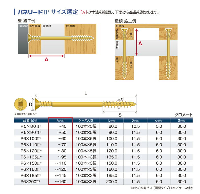 パネリード2+は外張り断熱工法用ビスとして 優れた性能と施工性が評価された断熱材メーカー・外装材メーカー各社の推奨品です ■販売単位:100本入り×5単位1ケース 四角ビットNo.3(両面タイプ)1本付 ●外壁材を支える高い強度 パネリード2+は外張り断熱工法用ビスとしての最適設計により 外壁の垂れ下がりを防止する高い強度を実現しています 住宅の長寿命化はもちろん 地震によっても外壁材の垂れ下がりを起こすことなく 今日の外張り断熱住宅を支えています ●ビス間隔の算定が可能 パネリード2+は性能が明確になっているので 外壁の垂れ下がりを防止するビス間隔の算定が可能です 外壁材の種類や断熱材の厚みなどに合わせて個別にビス間隔を算定することができます サイズ選定 施工例を参考に「A」の寸法を確認し 使用するパネリード2+のサイズを選びます ●特殊な先端刃先で木割れ防止 パネリード2+は耐食性と施工性に優れた「クロメート」表面処理を採用しています クロメートは表面の凹凸がが少ない施工性に優れた表面処理です さらにWAXコーティングを施すことで 打ち込み時にねじが受ける摩擦を30%以上低減させ 見た目ではわからない「スムーズな施工性」を実現しています ●断熱材メーカー 外装材メーカー各社の推奨品 パネリードは外張り断熱工法用ビスとして各社から推奨をいただいており 安心してご使用いただけます 以下は推奨いただいた主なメーカーです 【断熱材メーカー名】 アキレス(株)・旭ファイバーグラス(株) (株)イノアックコーポレーション・(株)カネカ 倉敷紡績(株)・(株)JSP・ダウ化工(株)・フクビ化学工業(株) 【外装材メーカー名】 (株)アイコットリョーワ・旭トステム外装(株)・ケイミュー(株) 神島化学工業(株)・東レACE(株)・ニチハ(株)・(株)LIXIL(INAX) ●付加断熱工法の場合 付加断熱工法とは「内断熱」と「外張り断熱」をダブルで行う工法です 北海道のような寒い地域で次世代省エネ基準を満たす場合 高性能GW16Kを105mm充填しただけでは足りませんが 外張り断熱を足すことでクリアできる場合があります また それ以外の地域でも省エネ性能を高めるために今後普及していく可能性がある工法です ●外張り断熱部分がプラスチック系断熱材のとき 付加断熱工法においても、外張り断熱部分が発泡プラスチック系断熱材の場合は 「パネリード2+」を使用して通常の外張り断熱工法と同様にサイズ選定やビス留めピッチを算定します ●外張り断熱部分が繊維系断熱材のとき 外張り断熱に繊維系断熱材を使用する施工には補助桟をパネリード2+で留め付けます この場合は補助桟の厚みをA寸法としてサイズを選定します ・本製品は構造用途にも対応しています ■施工箇所:外張り断熱工法の通気胴縁や通気垂木留め ■表面処理:クロメート ■サイズ:長さ100×頭直径11.5×軸径6.0×ネジ長さ30mm ※頭部サイズ刻印入り ■Aサイズ:〜60mm ※Aサイズは基本的には通気胴縁・通気垂木の厚さ+断熱材の厚さとなります ※断熱材の下に面材がある場合で面材が構造用合板・OSB・パーティクルボードの以外の場合は 面材の厚さをAサイズに加えて下さい ■使用ビット:四角ビット No.3 ■販売単位:100本入り×5単位1ケース 四角ビットNo.3(両面タイプ)1本付 (231-277) ビスを引き抜く際には、素手で触ると火傷する場合が御座いますので 作業手袋などの着用をお勧めします ※摩擦により高温になります 類似商品はこちら外壁用 木工用 ネジ ビス パネリード2 P620,742円外壁用 木工用 ネジ ビス パネリード2 P620,075円外壁用 木工用 ネジ ビス パネリード2 P616,357円外壁用 木工用 ネジ ビス パネリード2 P617,771円外壁用 木工用 ネジ ビス パネリード2 P625,645円外壁用 木工用 ネジ ビス パネリード2 P619,798円外壁用 木工用 ネジ ビス パネリード2 P641,862円外壁用 木工用 ネジ ビス パネリード2 P633,093円外壁用 木工用 ネジ ビス パネリード2 P511,564円新着商品はこちら2025/11/14メタカラー 積水樹脂 セキスイ コネクター A693円2025/11/14メタカラー 積水樹脂 セキスイ コネクター A656円2025/11/14メタカラー 積水樹脂 セキスイ コネクター S603円【パネリード2 皿 サラ 頭 サイズバリエーション】 ■5×80mm クロメート 四角No.3 100本入り1箱 はこちら > ■6×90mm クロメート 四角No.3 100本入り1箱 はこちら > ■6×100mm クロメート 四角No.3 100本入り1箱 はこちら > ■6×110mm クロメート 四角No.3 100本入り1箱 はこちら > ■6×120mm クロメート 四角No.3 100本入り1箱 はこちら > ■6×135mm クロメート 四角No.3 100本入り1箱 はこちら > ■6×150mm クロメート 四角No.3 100本入り1箱 はこちら > ■6×160mm クロメート 四角No.3 100本入り1箱 はこちら > ■6×185mm クロメート 四角No.3 100本入り1箱 はこちら > ■6×200mm クロメート 四角No.3 100本入り1箱 はこちら > ■5×80mm クロメート 100本入り×5単位1ケース はこちら > ■6×90mm クロメート 100本入り×5単位1ケース はこちら > ■6×100mm クロメート 100本入り×5単位1ケース はこちら > ■6×110mm クロメート 100本入り×5単位1ケース はこちら > ■6×120mm クロ